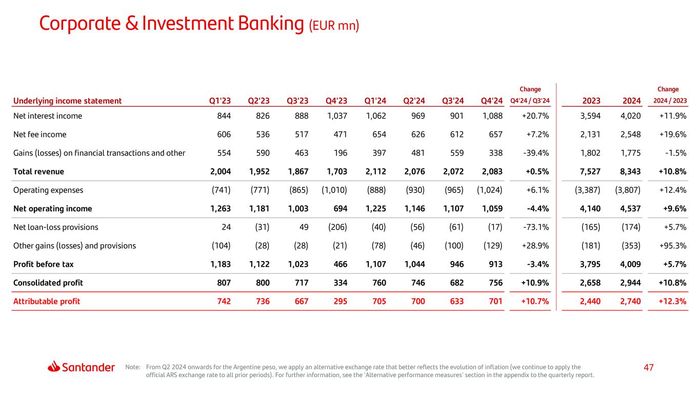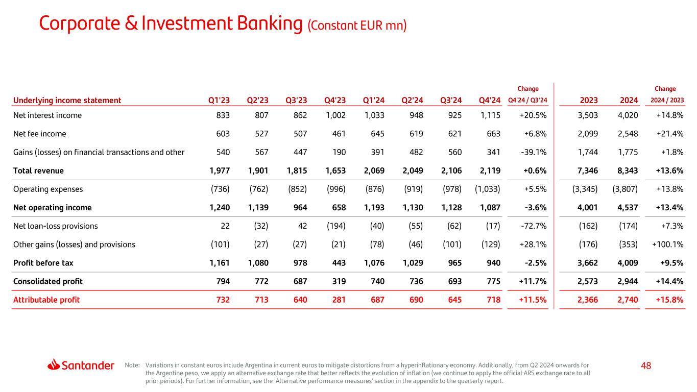 47 Corporate & Investment Banking (EUR mn) Change Change Underlying income statement Q1'23 Q2'23 Q3'23 Q4'23 Q1'24 Q2'24 Q3'24 Q4'24 Q4'24 / Q3'24 2023 2024 2024 / 2023 Net interest income 844 826 888 1,037 1,062 969 901 1,088 +20.7% 3,594 4,020 +11.9% Net fee income 606 536 517 471 654 626 612 657 +7.2% 2,131 2,548 +19.6% Gains (losses) on financial transactions and other 554 590 463 196 397 481 559 338 -39.4% 1,802 1,775 -1.5% Total revenue 2,004 1,952 1,867 1,703 2,112 2,076 2,072 2,083 +0.5% 7,527 8,343 +10.8% Operating expenses (741) (771) (865) (1,010) (888) (930) (965) (1,024) +6.1% (3,387) (3,807) +12.4% Net operating income 1,263 1,181 1,003 694 1,225 1,146 1,107 1,059 -4.4% 4,140 4,537 +9.6% Net loan-loss provisions 24 (31) 49 (206) (40) (56) (61) (17) -73.1% (165) (174) +5.7% Other gains (losses) and provisions (104) (28) (28) (21) (78) (46) (100) (129) +28.9% (181) (353) +95.3% Profit before tax 1,183 1,122 1,023 466 1,107 1,044 946 913 -3.4% 3,795 4,009 +5.7% Consolidated profit 807 800 717 334 760 746 682 756 +10.9% 2,658 2,944 +10.8% Attributable profit 742 736 667 295 705 700 633 701 +10.7% 2,440 2,740 +12.3% Note: From Q2 2024 onwards for the Argentine peso, we apply an alternative exchange rate that better reflects the evolution of inflation (we continue to apply the official ARS exchange rate to all prior periods). For further information, see the 'Alternative performance measures' section in the appendix to the quarterly report.