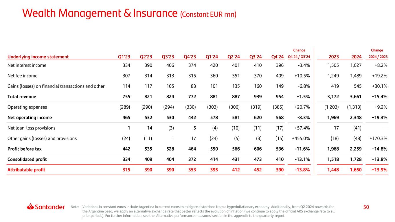 49 Wealth Management & Insurance (EUR mn) Change Change Underlying income statement Q1'23 Q2'23 Q3'23 Q4'23 Q1'24 Q2'24 Q3'24 Q4'24 Q4'24 / Q3'24 2023 2024 2024 / 2023 Net interest income 334 392 409 377 423 404 406 394 -3.1% 1,513 1,627 +7.6% Net fee income 308 317 318 319 364 355 366 405 +10.8% 1,262 1,489 +18.0% Gains (losses) on financial transactions and other 116 121 110 88 105 138 157 144 -8.1% 436 545 +25.1% Total revenue 758 830 838 784 892 897 929 944 +1.5% 3,210 3,661 +14.0% Operating expenses (291) (293) (297) (335) (306) (309) (315) (383) +21.4% (1,216) (1,313) +8.0% Net operating income 467 538 540 449 585 588 614 561 -8.6% 1,994 2,348 +17.7% Net loan-loss provisions 1 14 (3) 5 (4) (10) (11) (17) +55.5% 17 (41) — Other gains (losses) and provisions (24) (11) 0 17 (24) (5) (3) (15) +459.1% (18) (48) +170.8% Profit before tax 444 541 537 471 557 573 600 529 -11.9% 1,994 2,259 +13.3% Consolidated profit 335 415 412 378 420 436 468 404 -13.6% 1,540 1,728 +12.2% Attributable profit 316 395 397 358 400 417 448 384 -14.2% 1,467 1,650 +12.5% Note: From Q2 2024 onwards for the Argentine peso, we apply an alternative exchange rate that better reflects the evolution of inflation (we continue to apply the official ARS exchange rate to all prior periods). For further information, see the 'Alternative performance measures' section in the appendix to the quarterly report.