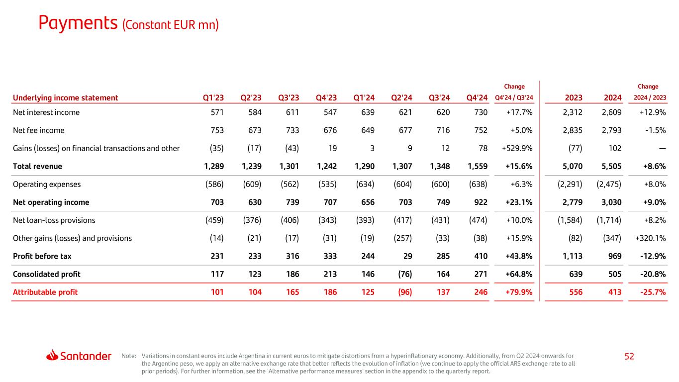 51 Payments (EUR mn) Change Change Underlying income statement Q1'23 Q2'23 Q3'23 Q4'23 Q1'24 Q2'24 Q3'24 Q4'24 Q4'24 / Q3'24 2023 2024 2024 / 2023 Net interest income 582 611 649 582 675 645 596 694 +16.4% 2,424 2,609 +7.6% Net fee income 770 703 772 708 676 695 698 725 +3.8% 2,952 2,793 -5.4% Gains (losses) on financial transactions and other (36) (17) (44) 19 2 8 13 79 +505.6% (78) 102 — Total revenue 1,316 1,297 1,376 1,309 1,353 1,347 1,307 1,497 +14.6% 5,298 5,505 +3.9% Operating expenses (589) (623) (581) (550) (650) (615) (588) (621) +5.6% (2,344) (2,475) +5.6% Net operating income 726 674 795 759 703 732 719 876 +21.9% 2,954 3,030 +2.6% Net loan-loss provisions (471) (397) (435) (363) (418) (434) (414) (448) +8.2% (1,666) (1,714) +2.9% Other gains (losses) and provisions (14) (21) (18) (31) (20) (257) (32) (37) +15.7% (84) (347) +314.3% Profit before tax 241 256 342 365 265 41 272 391 +43.5% 1,205 969 -19.6% Consolidated profit 124 137 202 233 159 (68) 156 259 +65.8% 696 505 -27.4% Attributable profit 107 116 179 204 137 (89) 129 235 +82.1% 607 413 -31.9% Note: From Q2 2024 onwards for the Argentine peso, we apply an alternative exchange rate that better reflects the evolution of inflation (we continue to apply the official ARS exchange rate to all prior periods). For further information, see the 'Alternative performance measures' section in the appendix to the quarterly report.