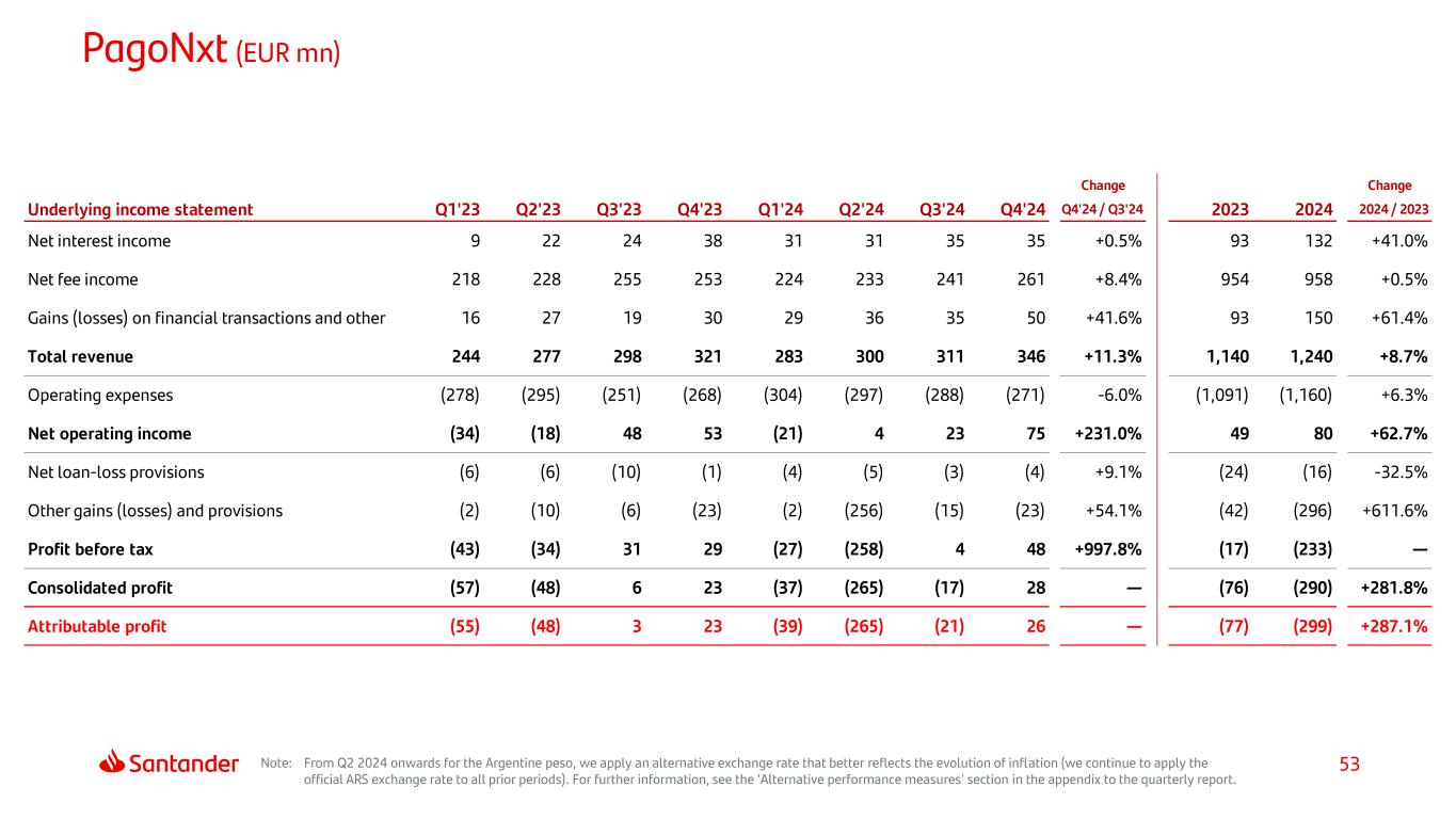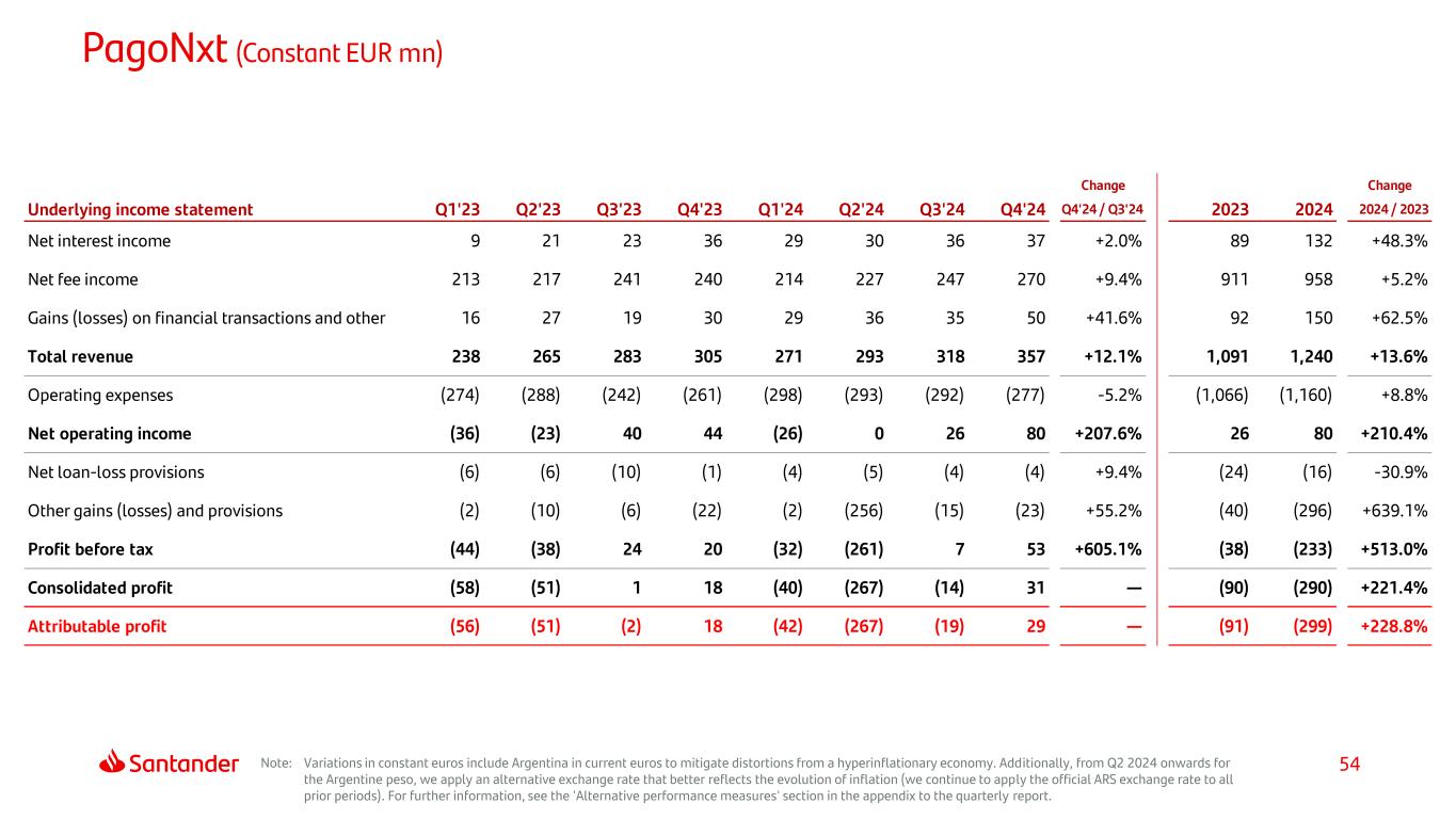 53 PagoNxt (EUR mn) Change Change Underlying income statement Q1'23 Q2'23 Q3'23 Q4'23 Q1'24 Q2'24 Q3'24 Q4'24 Q4'24 / Q3'24 2023 2024 2024 / 2023 Net interest income 9 22 24 38 31 31 35 35 +0.5% 93 132 +41.0% Net fee income 218 228 255 253 224 233 241 261 +8.4% 954 958 +0.5% Gains (losses) on financial transactions and other 16 27 19 30 29 36 35 50 +41.6% 93 150 +61.4% Total revenue 244 277 298 321 283 300 311 346 +11.3% 1,140 1,240 +8.7% Operating expenses (278) (295) (251) (268) (304) (297) (288) (271) -6.0% (1,091) (1,160) +6.3% Net operating income (34) (18) 48 53 (21) 4 23 75 +231.0% 49 80 +62.7% Net loan-loss provisions (6) (6) (10) (1) (4) (5) (3) (4) +9.1% (24) (16) -32.5% Other gains (losses) and provisions (2) (10) (6) (23) (2) (256) (15) (23) +54.1% (42) (296) +611.6% Profit before tax (43) (34) 31 29 (27) (258) 4 48 +997.8% (17) (233) — Consolidated profit (57) (48) 6 23 (37) (265) (17) 28 — (76) (290) +281.8% Attributable profit (55) (48) 3 23 (39) (265) (21) 26 — (77) (299) +287.1% Note: From Q2 2024 onwards for the Argentine peso, we apply an alternative exchange rate that better reflects the evolution of inflation (we continue to apply the official ARS exchange rate to all prior periods). For further information, see the 'Alternative performance measures' section in the appendix to the quarterly report.