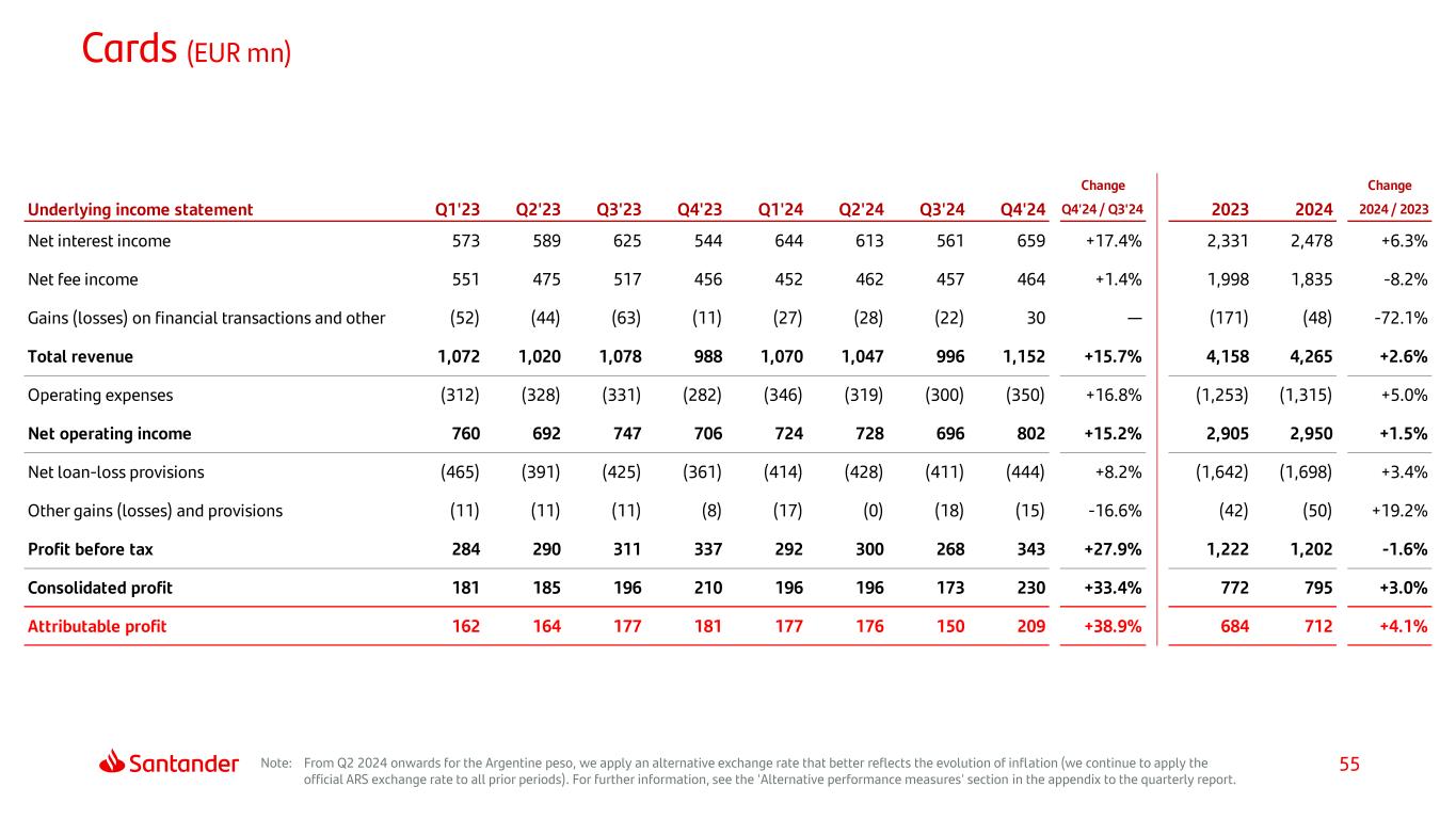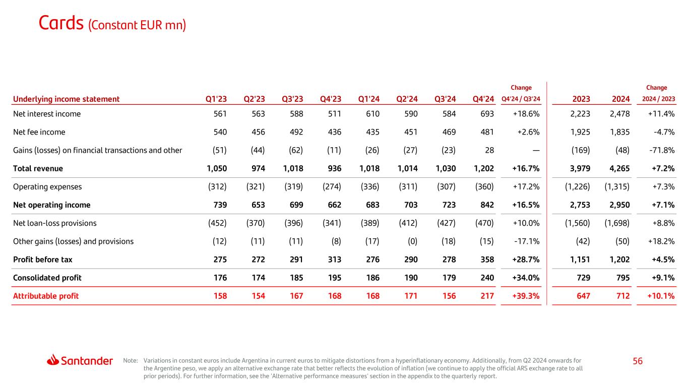 55 Cards (EUR mn) Change Change Underlying income statement Q1'23 Q2'23 Q3'23 Q4'23 Q1'24 Q2'24 Q3'24 Q4'24 Q4'24 / Q3'24 2023 2024 2024 / 2023 Net interest income 573 589 625 544 644 613 561 659 +17.4% 2,331 2,478 +6.3% Net fee income 551 475 517 456 452 462 457 464 +1.4% 1,998 1,835 -8.2% Gains (losses) on financial transactions and other (52) (44) (63) (11) (27) (28) (22) 30 — (171) (48) -72.1% Total revenue 1,072 1,020 1,078 988 1,070 1,047 996 1,152 +15.7% 4,158 4,265 +2.6% Operating expenses (312) (328) (331) (282) (346) (319) (300) (350) +16.8% (1,253) (1,315) +5.0% Net operating income 760 692 747 706 724 728 696 802 +15.2% 2,905 2,950 +1.5% Net loan-loss provisions (465) (391) (425) (361) (414) (428) (411) (444) +8.2% (1,642) (1,698) +3.4% Other gains (losses) and provisions (11) (11) (11) (8) (17) (0) (18) (15) -16.6% (42) (50) +19.2% Profit before tax 284 290 311 337 292 300 268 343 +27.9% 1,222 1,202 -1.6% Consolidated profit 181 185 196 210 196 196 173 230 +33.4% 772 795 +3.0% Attributable profit 162 164 177 181 177 176 150 209 +38.9% 684 712 +4.1% Note: From Q2 2024 onwards for the Argentine peso, we apply an alternative exchange rate that better reflects the evolution of inflation (we continue to apply the official ARS exchange rate to all prior periods). For further information, see the 'Alternative performance measures' section in the appendix to the quarterly report.