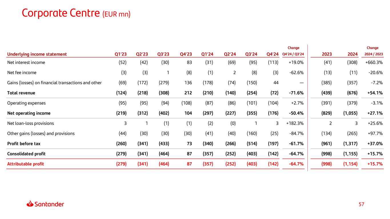 57 Corporate Centre (EUR mn) Change Change Underlying income statement Q1'23 Q2'23 Q3'23 Q4'23 Q1'24 Q2'24 Q3'24 Q4'24 Q4'24 / Q3'24 2023 2024 2024 / 2023 Net interest income (52) (42) (30) 83 (31) (69) (95) (113) +19.0% (41) (308) +660.3% Net fee income (3) (3) 1 (8) (1) 2 (8) (3) -62.6% (13) (11) -20.6% Gains (losses) on financial transactions and other (69) (172) (279) 136 (178) (74) (150) 44 — (385) (357) -7.2% Total revenue (124) (218) (308) 212 (210) (140) (254) (72) -71.6% (439) (676) +54.1% Operating expenses (95) (95) (94) (108) (87) (86) (101) (104) +2.7% (391) (379) -3.1% Net operating income (219) (312) (402) 104 (297) (227) (355) (176) -50.4% (829) (1,055) +27.1% Net loan-loss provisions 3 1 (1) (1) (2) (0) 1 3 +182.3% 2 3 +25.6% Other gains (losses) and provisions (44) (30) (30) (30) (41) (40) (160) (25) -84.7% (134) (265) +97.7% Profit before tax (260) (341) (433) 73 (340) (266) (514) (197) -61.7% (961) (1,317) +37.0% Consolidated profit (279) (341) (464) 87 (357) (252) (403) (142) -64.7% (998) (1,155) +15.7% Attributable profit (279) (341) (464) 87 (357) (252) (403) (142) -64.7% (998) (1,154) +15.7%