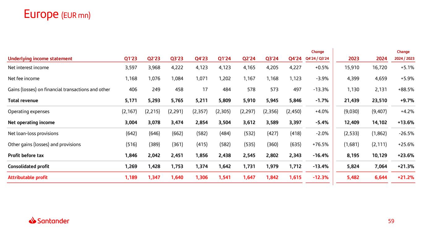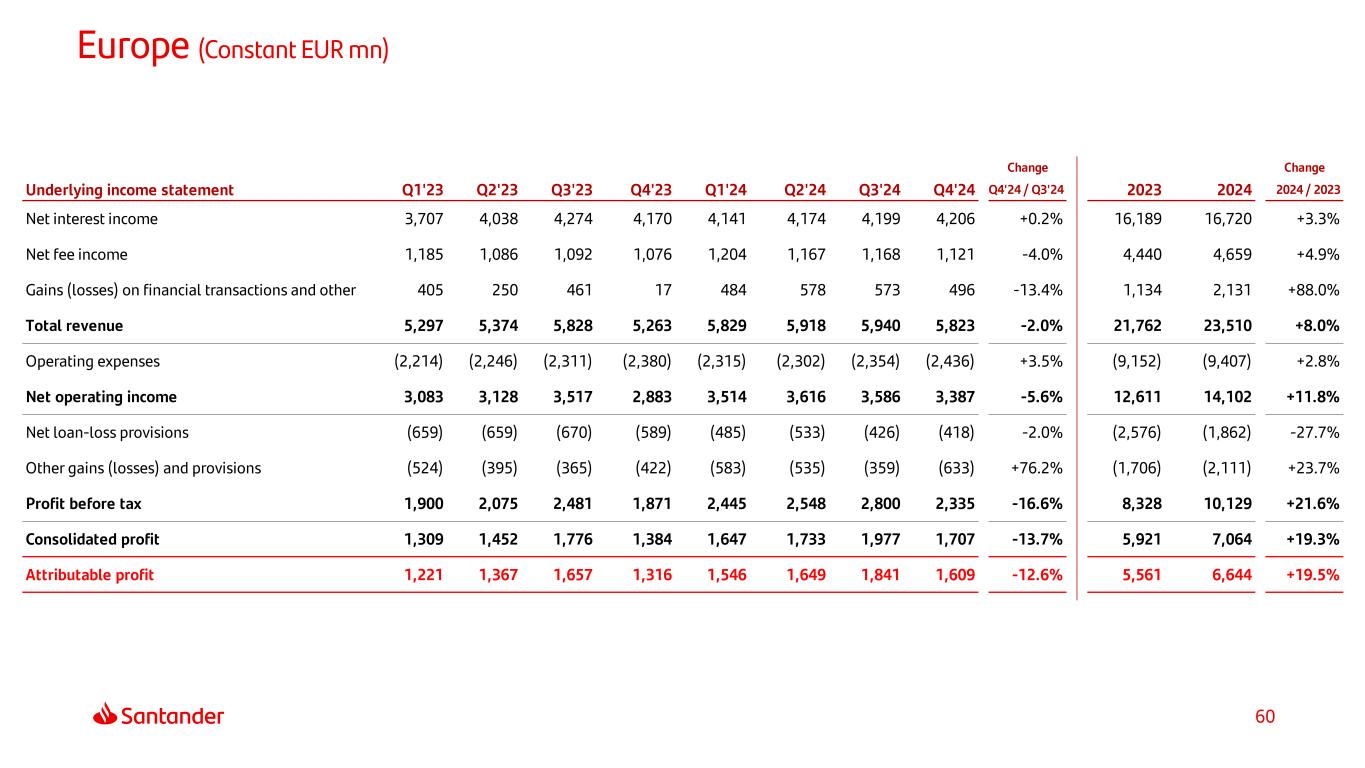 59 Europe (EUR mn) Change Change Underlying income statement Q1'23 Q2'23 Q3'23 Q4'23 Q1'24 Q2'24 Q3'24 Q4'24 Q4'24 / Q3'24 2023 2024 2024 / 2023 Net interest income 3,597 3,968 4,222 4,123 4,123 4,165 4,205 4,227 +0.5% 15,910 16,720 +5.1% Net fee income 1,168 1,076 1,084 1,071 1,202 1,167 1,168 1,123 -3.9% 4,399 4,659 +5.9% Gains (losses) on financial transactions and other 406 249 458 17 484 578 573 497 -13.3% 1,130 2,131 +88.5% Total revenue 5,171 5,293 5,765 5,211 5,809 5,910 5,945 5,846 -1.7% 21,439 23,510 +9.7% Operating expenses (2,167) (2,215) (2,291) (2,357) (2,305) (2,297) (2,356) (2,450) +4.0% (9,030) (9,407) +4.2% Net operating income 3,004 3,078 3,474 2,854 3,504 3,612 3,589 3,397 -5.4% 12,409 14,102 +13.6% Net loan-loss provisions (642) (646) (662) (582) (484) (532) (427) (418) -2.0% (2,533) (1,862) -26.5% Other gains (losses) and provisions (516) (389) (361) (415) (582) (535) (360) (635) +76.5% (1,681) (2,111) +25.6% Profit before tax 1,846 2,042 2,451 1,856 2,438 2,545 2,802 2,343 -16.4% 8,195 10,129 +23.6% Consolidated profit 1,269 1,428 1,753 1,374 1,642 1,731 1,979 1,712 -13.4% 5,824 7,064 +21.3% Attributable profit 1,189 1,347 1,640 1,306 1,541 1,647 1,842 1,615 -12.3% 5,482 6,644 +21.2%