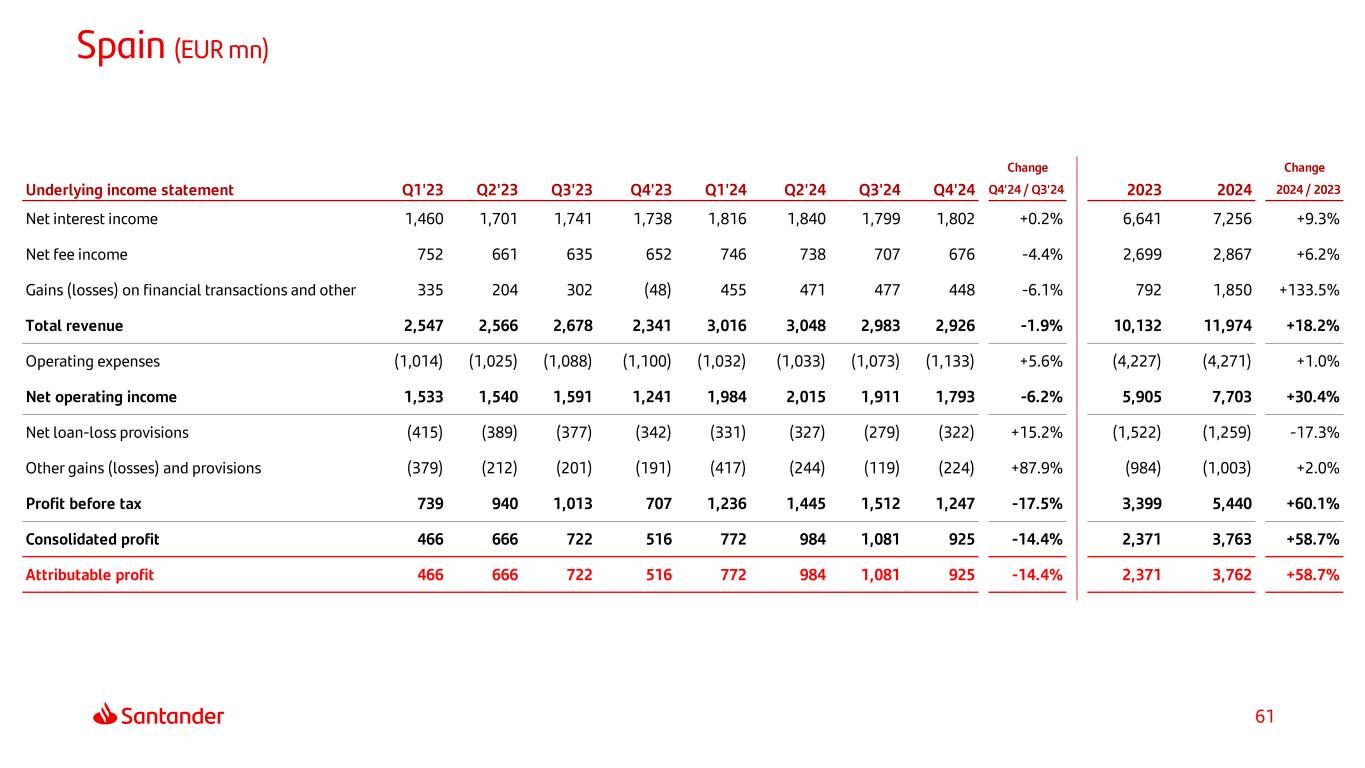 61 Spain (EUR mn) Change Change Underlying income statement Q1'23 Q2'23 Q3'23 Q4'23 Q1'24 Q2'24 Q3'24 Q4'24 Q4'24 / Q3'24 2023 2024 2024 / 2023 Net interest income 1,460 1,701 1,741 1,738 1,816 1,840 1,799 1,802 +0.2% 6,641 7,256 +9.3% Net fee income 752 661 635 652 746 738 707 676 -4.4% 2,699 2,867 +6.2% Gains (losses) on financial transactions and other 335 204 302 (48) 455 471 477 448 -6.1% 792 1,850 +133.5% Total revenue 2,547 2,566 2,678 2,341 3,016 3,048 2,983 2,926 -1.9% 10,132 11,974 +18.2% Operating expenses (1,014) (1,025) (1,088) (1,100) (1,032) (1,033) (1,073) (1,133) +5.6% (4,227) (4,271) +1.0% Net operating income 1,533 1,540 1,591 1,241 1,984 2,015 1,911 1,793 -6.2% 5,905 7,703 +30.4% Net loan-loss provisions (415) (389) (377) (342) (331) (327) (279) (322) +15.2% (1,522) (1,259) -17.3% Other gains (losses) and provisions (379) (212) (201) (191) (417) (244) (119) (224) +87.9% (984) (1,003) +2.0% Profit before tax 739 940 1,013 707 1,236 1,445 1,512 1,247 -17.5% 3,399 5,440 +60.1% Consolidated profit 466 666 722 516 772 984 1,081 925 -14.4% 2,371 3,763 +58.7% Attributable profit 466 666 722 516 772 984 1,081 925 -14.4% 2,371 3,762 +58.7%