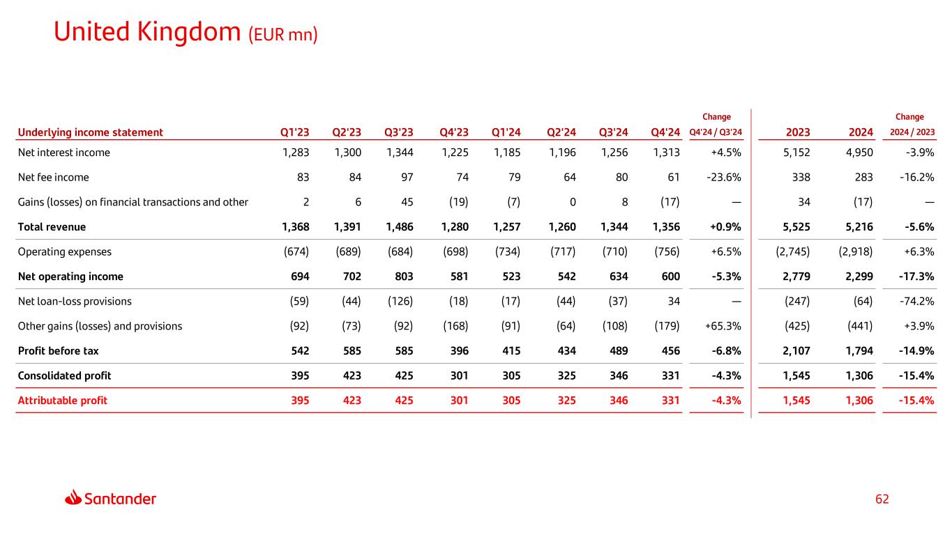 63 United Kingdom (Constant EUR mn) Change Change Underlying income statement Q1'23 Q2'23 Q3'23 Q4'23 Q1'24 Q2'24 Q3'24 Q4'24 Q4'24 / Q3'24 2023 2024 2024 / 2023 Net interest income 1,338 1,335 1,365 1,254 1,199 1,205 1,254 1,292 +3.0% 5,293 4,950 -6.5% Net fee income 86 87 98 76 80 64 80 60 -25.1% 347 283 -18.4% Gains (losses) on financial transactions and other 3 6 46 (20) (7) 0 8 (17) — 35 (17) — Total revenue 1,427 1,429 1,510 1,310 1,271 1,270 1,341 1,334 -0.5% 5,676 5,216 -8.1% Operating expenses (703) (708) (694) (715) (743) (723) (708) (744) +5.0% (2,820) (2,918) +3.4% Net operating income 724 721 816 595 529 547 633 590 -6.7% 2,856 2,299 -19.5% Net loan-loss provisions (62) (45) (129) (18) (18) (44) (37) 35 — (254) (64) -74.9% Other gains (losses) and provisions (96) (75) (94) (172) (92) (64) (108) (177) +63.9% (436) (441) +1.1% Profit before tax 566 601 594 405 419 438 489 448 -8.3% 2,165 1,794 -17.1% Consolidated profit 412 435 432 308 309 327 345 325 -5.8% 1,587 1,306 -17.7% Attributable profit 412 435 432 308 309 327 345 325 -5.8% 1,587 1,306 -17.7%