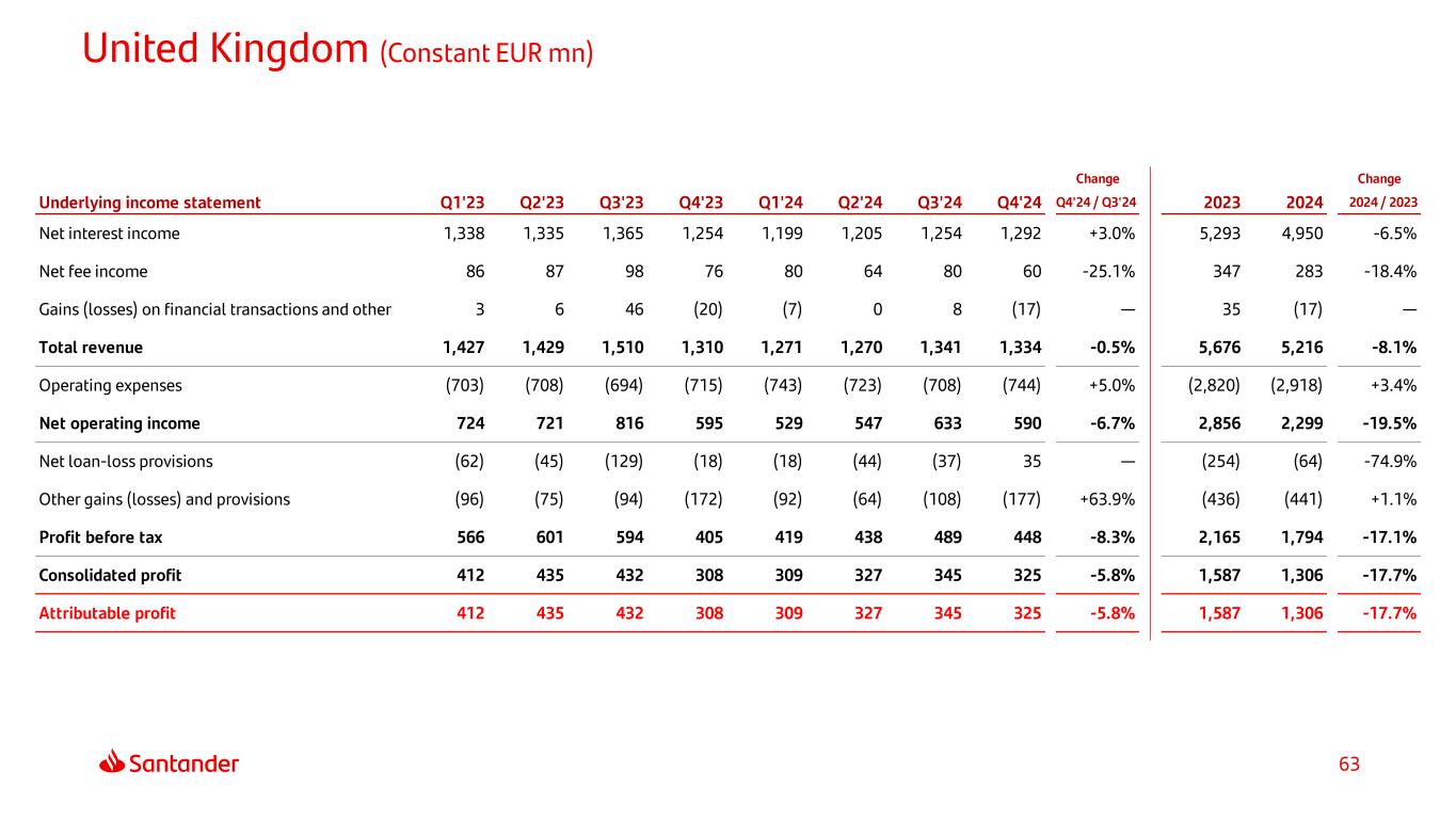62 United Kingdom (EUR mn) Change Change Underlying income statement Q1'23 Q2'23 Q3'23 Q4'23 Q1'24 Q2'24 Q3'24 Q4'24 Q4'24 / Q3'24 2023 2024 2024 / 2023 Net interest income 1,283 1,300 1,344 1,225 1,185 1,196 1,256 1,313 +4.5% 5,152 4,950 -3.9% Net fee income 83 84 97 74 79 64 80 61 -23.6% 338 283 -16.2% Gains (losses) on financial transactions and other 2 6 45 (19) (7) 0 8 (17) — 34 (17) — Total revenue 1,368 1,391 1,486 1,280 1,257 1,260 1,344 1,356 +0.9% 5,525 5,216 -5.6% Operating expenses (674) (689) (684) (698) (734) (717) (710) (756) +6.5% (2,745) (2,918) +6.3% Net operating income 694 702 803 581 523 542 634 600 -5.3% 2,779 2,299 -17.3% Net loan-loss provisions (59) (44) (126) (18) (17) (44) (37) 34 — (247) (64) -74.2% Other gains (losses) and provisions (92) (73) (92) (168) (91) (64) (108) (179) +65.3% (425) (441) +3.9% Profit before tax 542 585 585 396 415 434 489 456 -6.8% 2,107 1,794 -14.9% Consolidated profit 395 423 425 301 305 325 346 331 -4.3% 1,545 1,306 -15.4% Attributable profit 395 423 425 301 305 325 346 331 -4.3% 1,545 1,306 -15.4%