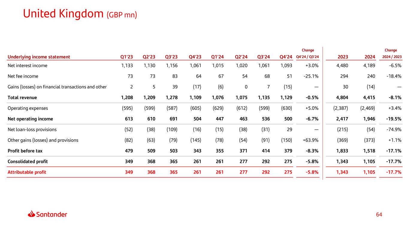 64 United Kingdom (GBP mn) Change Change Underlying income statement Q1'23 Q2'23 Q3'23 Q4'23 Q1'24 Q2'24 Q3'24 Q4'24 Q4'24 / Q3'24 2023 2024 2024 / 2023 Net interest income 1,133 1,130 1,156 1,061 1,015 1,020 1,061 1,093 +3.0% 4,480 4,189 -6.5% Net fee income 73 73 83 64 67 54 68 51 -25.1% 294 240 -18.4% Gains (losses) on financial transactions and other 2 5 39 (17) (6) 0 7 (15) — 30 (14) — Total revenue 1,208 1,209 1,278 1,109 1,076 1,075 1,135 1,129 -0.5% 4,804 4,415 -8.1% Operating expenses (595) (599) (587) (605) (629) (612) (599) (630) +5.0% (2,387) (2,469) +3.4% Net operating income 613 610 691 504 447 463 536 500 -6.7% 2,417 1,946 -19.5% Net loan-loss provisions (52) (38) (109) (16) (15) (38) (31) 29 — (215) (54) -74.9% Other gains (losses) and provisions (82) (63) (79) (145) (78) (54) (91) (150) +63.9% (369) (373) +1.1% Profit before tax 479 509 503 343 355 371 414 379 -8.3% 1,833 1,518 -17.1% Consolidated profit 349 368 365 261 261 277 292 275 -5.8% 1,343 1,105 -17.7% Attributable profit 349 368 365 261 261 277 292 275 -5.8% 1,343 1,105 -17.7%