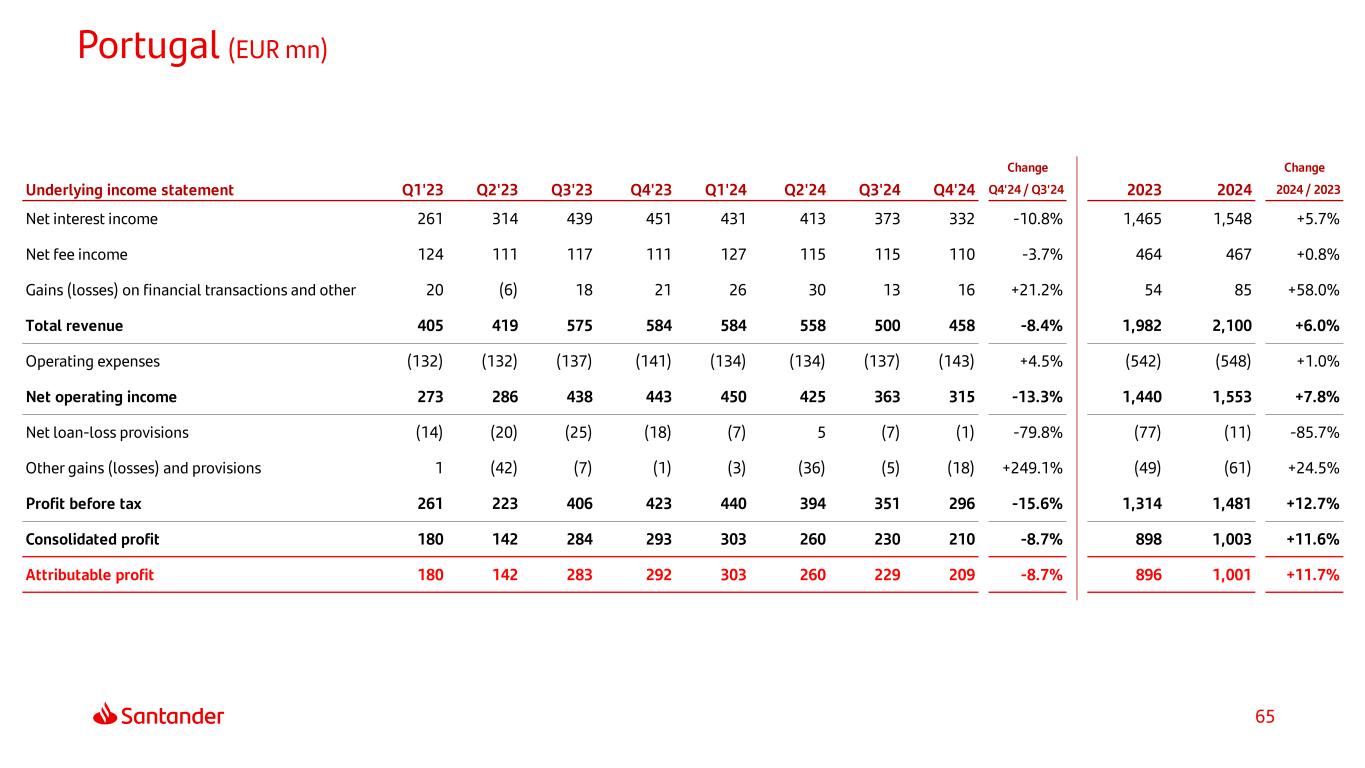 65 Portugal (EUR mn) Change Change Underlying income statement Q1'23 Q2'23 Q3'23 Q4'23 Q1'24 Q2'24 Q3'24 Q4'24 Q4'24 / Q3'24 2023 2024 2024 / 2023 Net interest income 261 314 439 451 431 413 373 332 -10.8% 1,465 1,548 +5.7% Net fee income 124 111 117 111 127 115 115 110 -3.7% 464 467 +0.8% Gains (losses) on financial transactions and other 20 (6) 18 21 26 30 13 16 +21.2% 54 85 +58.0% Total revenue 405 419 575 584 584 558 500 458 -8.4% 1,982 2,100 +6.0% Operating expenses (132) (132) (137) (141) (134) (134) (137) (143) +4.5% (542) (548) +1.0% Net operating income 273 286 438 443 450 425 363 315 -13.3% 1,440 1,553 +7.8% Net loan-loss provisions (14) (20) (25) (18) (7) 5 (7) (1) -79.8% (77) (11) -85.7% Other gains (losses) and provisions 1 (42) (7) (1) (3) (36) (5) (18) +249.1% (49) (61) +24.5% Profit before tax 261 223 406 423 440 394 351 296 -15.6% 1,314 1,481 +12.7% Consolidated profit 180 142 284 293 303 260 230 210 -8.7% 898 1,003 +11.6% Attributable profit 180 142 283 292 303 260 229 209 -8.7% 896 1,001 +11.7%