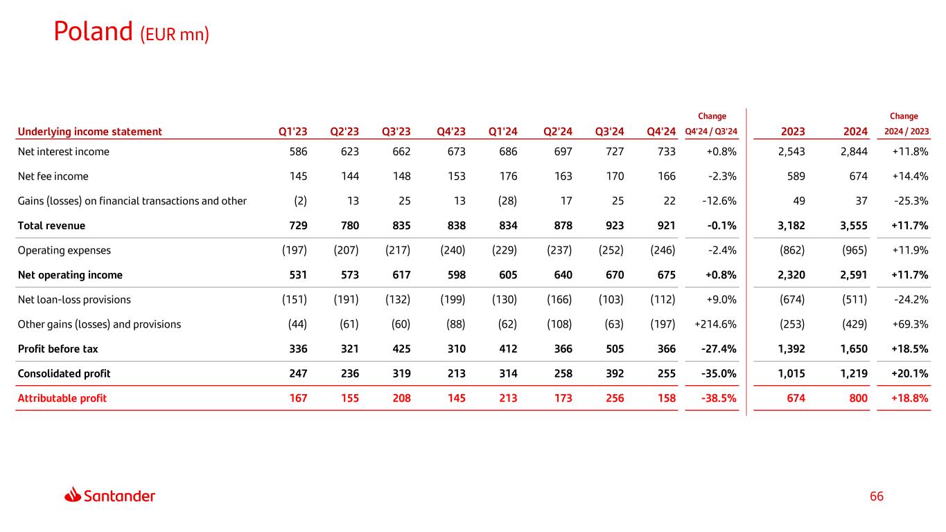 68 Poland (PLN mn) Change Change Underlying income statement Q1'23 Q2'23 Q3'23 Q4'23 Q1'24 Q2'24 Q3'24 Q4'24 Q4'24 / Q3'24 2023 2024 2024 / 2023 Net interest income 2,759 2,830 2,980 2,972 2,973 2,999 3,115 3,158 +1.4% 11,541 12,245 +6.1% Net fee income 682 653 665 675 761 700 727 714 -1.8% 2,675 2,902 +8.5% Gains (losses) on financial transactions and other (9) 62 114 56 (122) 75 110 96 -12.7% 224 159 -29.1% Total revenue 3,432 3,545 3,760 3,703 3,611 3,775 3,952 3,968 +0.4% 14,440 15,306 +6.0% Operating expenses (930) (941) (978) (1,065) (992) (1,021) (1,081) (1,060) -1.9% (3,913) (4,153) +6.1% Net operating income 2,502 2,604 2,782 2,638 2,619 2,754 2,871 2,908 +1.3% 10,527 11,153 +5.9% Net loan-loss provisions (713) (871) (591) (885) (565) (716) (439) (482) +9.9% (3,059) (2,201) -28.0% Other gains (losses) and provisions (208) (279) (271) (392) (268) (464) (268) (848) +216.9% (1,150) (1,848) +60.6% Profit before tax 1,581 1,454 1,920 1,362 1,786 1,575 2,165 1,578 -27.1% 6,318 7,104 +12.4% Consolidated profit 1,165 1,070 1,440 932 1,359 1,108 1,683 1,099 -34.7% 4,607 5,249 +13.9% Attributable profit 785 700 938 634 924 744 1,099 679 -38.2% 3,057 3,446 +12.7%