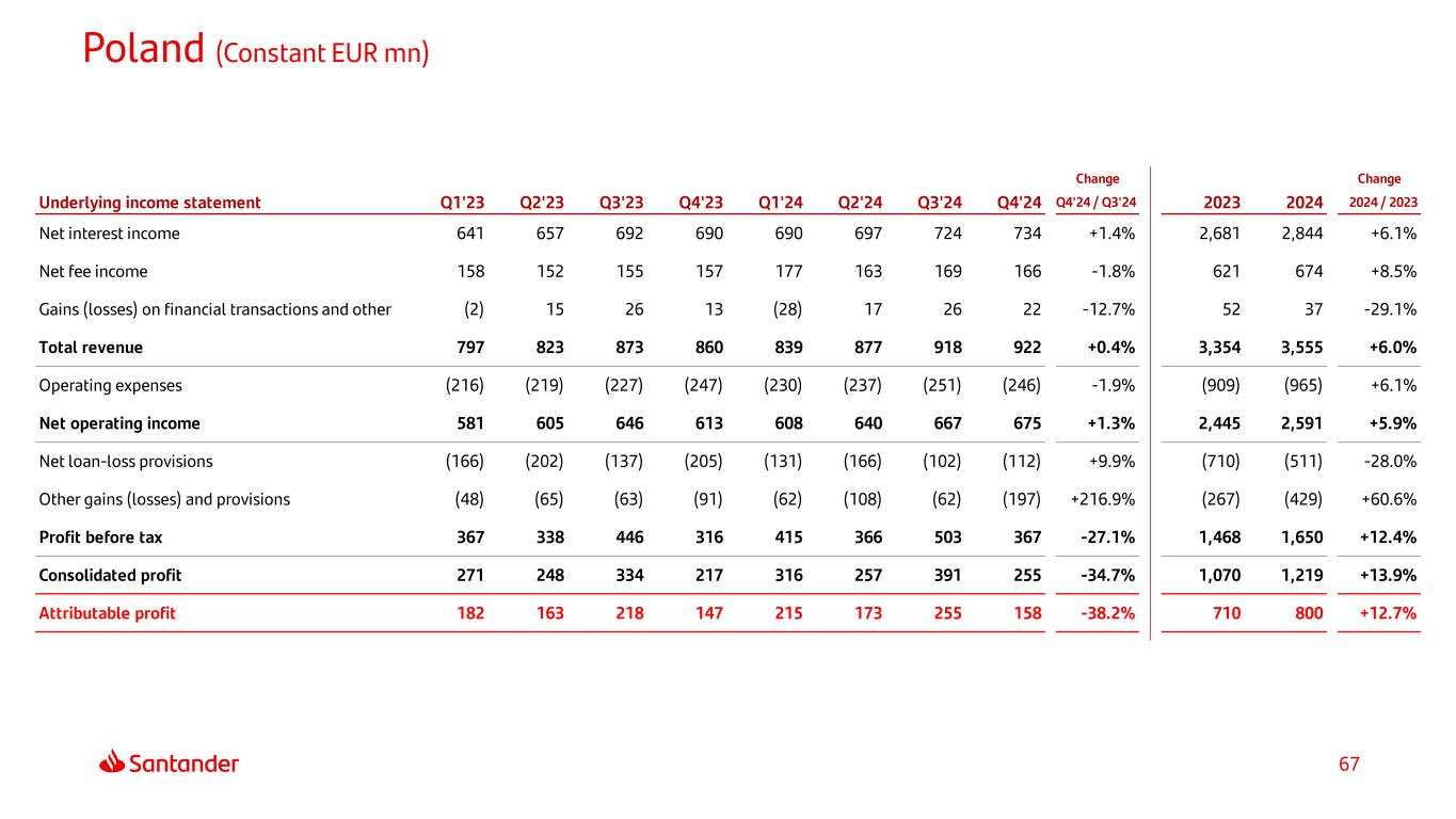 66 Poland (EUR mn) Change Change Underlying income statement Q1'23 Q2'23 Q3'23 Q4'23 Q1'24 Q2'24 Q3'24 Q4'24 Q4'24 / Q3'24 2023 2024 2024 / 2023 Net interest income 586 623 662 673 686 697 727 733 +0.8% 2,543 2,844 +11.8% Net fee income 145 144 148 153 176 163 170 166 -2.3% 589 674 +14.4% Gains (losses) on financial transactions and other (2) 13 25 13 (28) 17 25 22 -12.6% 49 37 -25.3% Total revenue 729 780 835 838 834 878 923 921 -0.1% 3,182 3,555 +11.7% Operating expenses (197) (207) (217) (240) (229) (237) (252) (246) -2.4% (862) (965) +11.9% Net operating income 531 573 617 598 605 640 670 675 +0.8% 2,320 2,591 +11.7% Net loan-loss provisions (151) (191) (132) (199) (130) (166) (103) (112) +9.0% (674) (511) -24.2% Other gains (losses) and provisions (44) (61) (60) (88) (62) (108) (63) (197) +214.6% (253) (429) +69.3% Profit before tax 336 321 425 310 412 366 505 366 -27.4% 1,392 1,650 +18.5% Consolidated profit 247 236 319 213 314 258 392 255 -35.0% 1,015 1,219 +20.1% Attributable profit 167 155 208 145 213 173 256 158 -38.5% 674 800 +18.8%