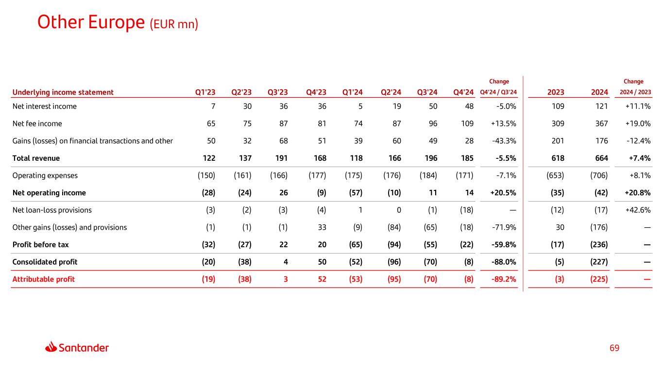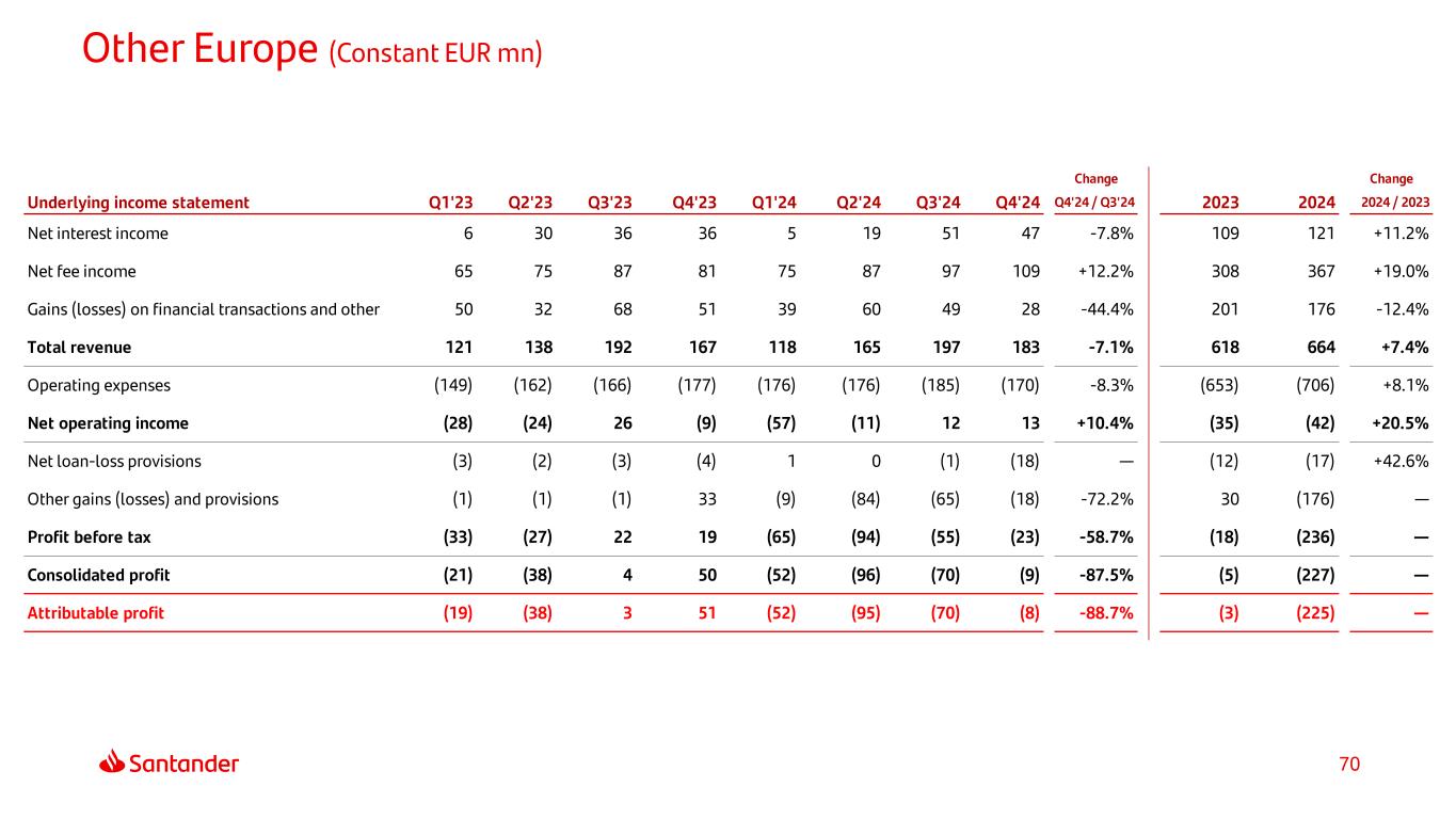 69 Other Europe (EUR mn) Change Change Underlying income statement Q1'23 Q2'23 Q3'23 Q4'23 Q1'24 Q2'24 Q3'24 Q4'24 Q4'24 / Q3'24 2023 2024 2024 / 2023 Net interest income 7 30 36 36 5 19 50 48 -5.0% 109 121 +11.1% Net fee income 65 75 87 81 74 87 96 109 +13.5% 309 367 +19.0% Gains (losses) on financial transactions and other 50 32 68 51 39 60 49 28 -43.3% 201 176 -12.4% Total revenue 122 137 191 168 118 166 196 185 -5.5% 618 664 +7.4% Operating expenses (150) (161) (166) (177) (175) (176) (184) (171) -7.1% (653) (706) +8.1% Net operating income (28) (24) 26 (9) (57) (10) 11 14 +20.5% (35) (42) +20.8% Net loan-loss provisions (3) (2) (3) (4) 1 0 (1) (18) — (12) (17) +42.6% Other gains (losses) and provisions (1) (1) (1) 33 (9) (84) (65) (18) -71.9% 30 (176) — Profit before tax (32) (27) 22 20 (65) (94) (55) (22) -59.8% (17) (236) — Consolidated profit (20) (38) 4 50 (52) (96) (70) (8) -88.0% (5) (227) — Attributable profit (19) (38) 3 52 (53) (95) (70) (8) -89.2% (3) (225) —