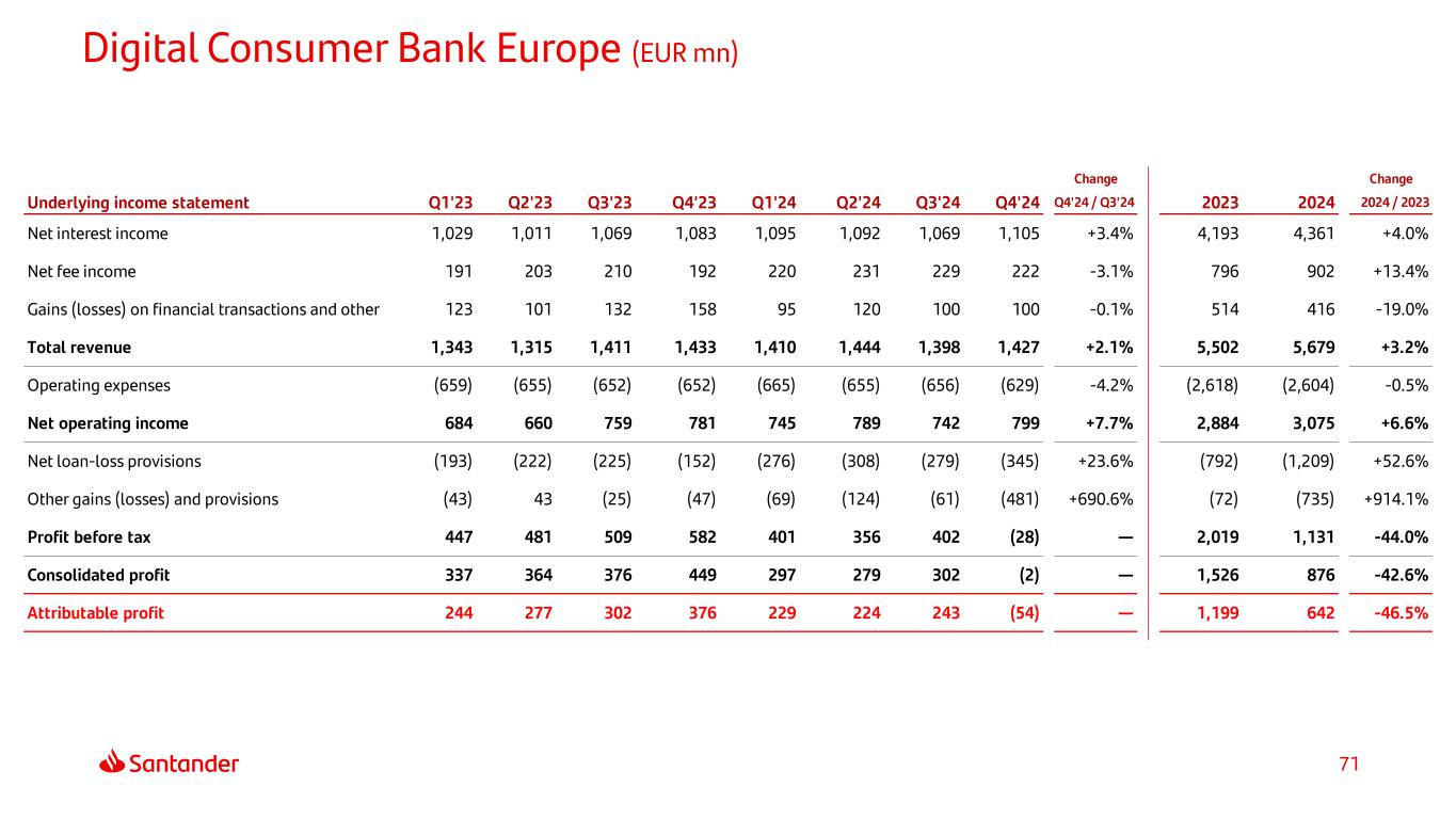 72 Digital Consumer Bank Europe (Constant EUR mn) Change Change Underlying income statement Q1'23 Q2'23 Q3'23 Q4'23 Q1'24 Q2'24 Q3'24 Q4'24 Q4'24 / Q3'24 2023 2024 2024 / 2023 Net interest income 1,030 1,016 1,070 1,087 1,093 1,092 1,070 1,106 +3.4% 4,203 4,361 +3.8% Net fee income 191 204 211 192 220 231 229 222 -3.1% 798 902 +13.1% Gains (losses) on financial transactions and other 124 102 133 158 95 121 100 100 -0.6% 517 416 -19.5% Total revenue 1,345 1,321 1,414 1,437 1,408 1,443 1,400 1,428 +2.0% 5,517 5,679 +2.9% Operating expenses (659) (657) (653) (653) (664) (654) (657) (629) -4.3% (2,622) (2,604) -0.7% Net operating income 686 664 761 784 744 789 743 799 +7.6% 2,895 3,075 +6.2% Net loan-loss provisions (193) (226) (225) (152) (275) (309) (280) (346) +23.6% (796) (1,209) +51.9% Other gains (losses) and provisions (44) 42 (25) (48) (69) (124) (61) (481) +692.6% (76) (735) +867.3% Profit before tax 449 480 511 583 400 356 402 (28) — 2,023 1,131 -44.1% Consolidated profit 338 364 377 450 297 278 302 (2) — 1,529 876 -42.7% Attributable profit 244 277 303 377 228 224 244 (54) — 1,201 642 -46.5%