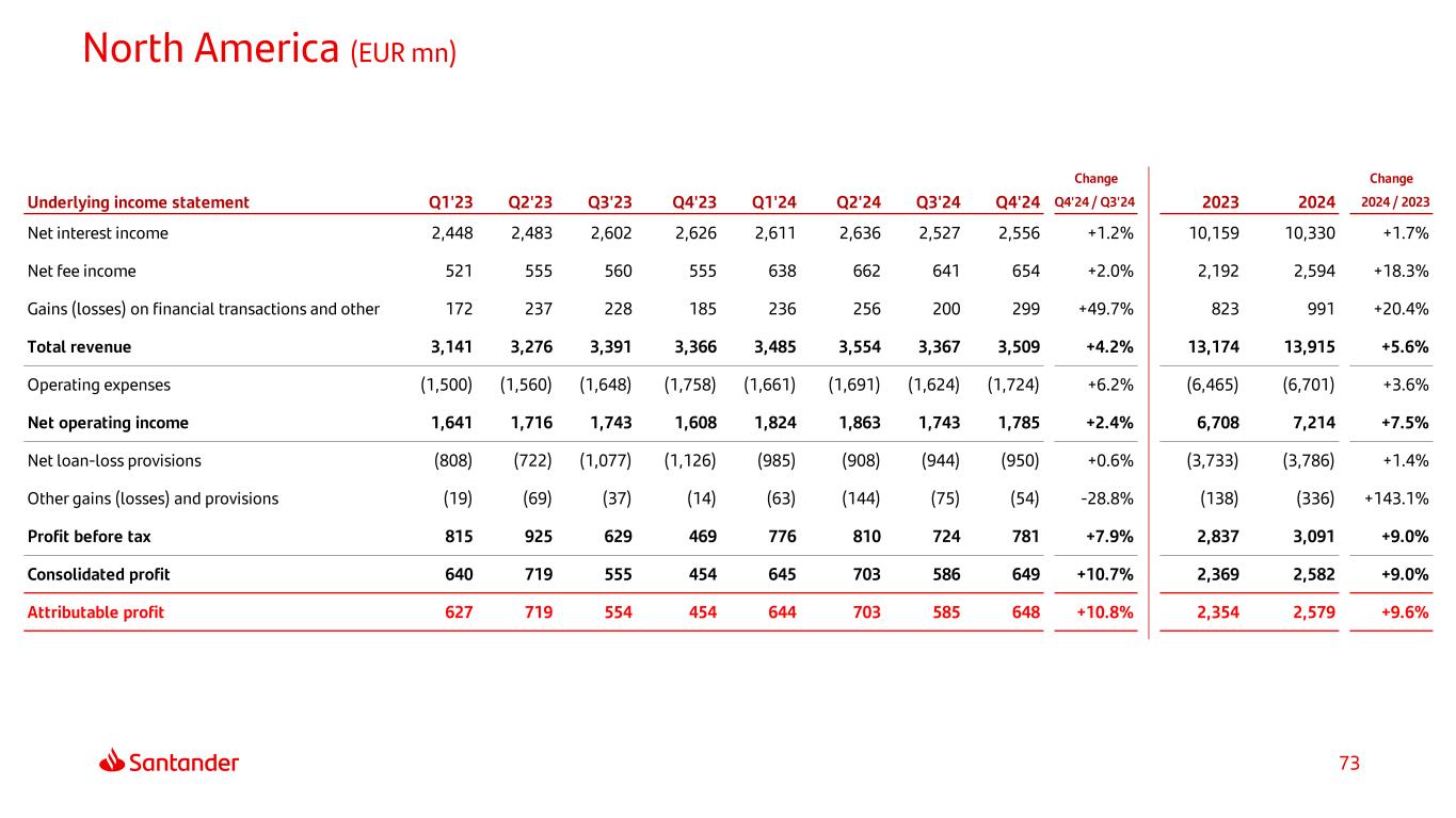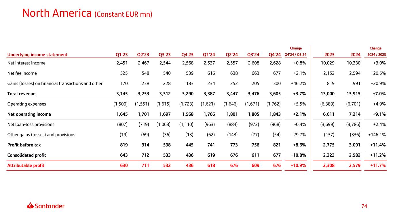 73 North America (EUR mn) Change Change Underlying income statement Q1'23 Q2'23 Q3'23 Q4'23 Q1'24 Q2'24 Q3'24 Q4'24 Q4'24 / Q3'24 2023 2024 2024 / 2023 Net interest income 2,448 2,483 2,602 2,626 2,611 2,636 2,527 2,556 +1.2% 10,159 10,330 +1.7% Net fee income 521 555 560 555 638 662 641 654 +2.0% 2,192 2,594 +18.3% Gains (losses) on financial transactions and other 172 237 228 185 236 256 200 299 +49.7% 823 991 +20.4% Total revenue 3,141 3,276 3,391 3,366 3,485 3,554 3,367 3,509 +4.2% 13,174 13,915 +5.6% Operating expenses (1,500) (1,560) (1,648) (1,758) (1,661) (1,691) (1,624) (1,724) +6.2% (6,465) (6,701) +3.6% Net operating income 1,641 1,716 1,743 1,608 1,824 1,863 1,743 1,785 +2.4% 6,708 7,214 +7.5% Net loan-loss provisions (808) (722) (1,077) (1,126) (985) (908) (944) (950) +0.6% (3,733) (3,786) +1.4% Other gains (losses) and provisions (19) (69) (37) (14) (63) (144) (75) (54) -28.8% (138) (336) +143.1% Profit before tax 815 925 629 469 776 810 724 781 +7.9% 2,837 3,091 +9.0% Consolidated profit 640 719 555 454 645 703 586 649 +10.7% 2,369 2,582 +9.0% Attributable profit 627 719 554 454 644 703 585 648 +10.8% 2,354 2,579 +9.6%