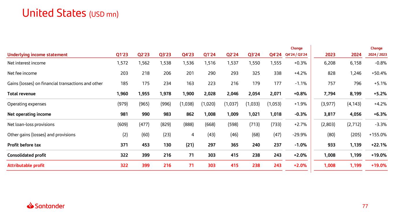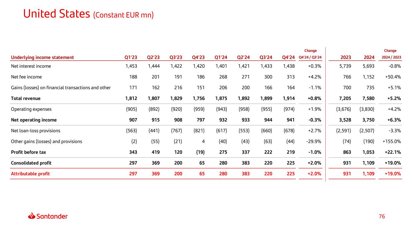 75 United States (EUR mn) Change Change Underlying income statement Q1'23 Q2'23 Q3'23 Q4'23 Q1'24 Q2'24 Q3'24 Q4'24 Q4'24 / Q3'24 2023 2024 2024 / 2023 Net interest income 1,465 1,436 1,414 1,428 1,396 1,428 1,411 1,458 +3.3% 5,742 5,693 -0.9% Net fee income 190 200 189 187 267 272 296 317 +7.0% 766 1,152 +50.3% Gains (losses) on financial transactions and other 173 161 215 152 205 201 163 167 +2.3% 701 735 +5.0% Total revenue 1,827 1,797 1,818 1,767 1,869 1,900 1,870 1,941 +3.8% 7,209 7,580 +5.1% Operating expenses (912) (887) (915) (964) (940) (963) (940) (987) +5.0% (3,679) (3,830) +4.1% Net operating income 915 910 903 802 929 938 929 954 +2.7% 3,531 3,750 +6.2% Net loan-loss provisions (567) (438) (764) (824) (615) (556) (650) (686) +5.6% (2,593) (2,507) -3.3% Other gains (losses) and provisions (2) (55) (21) 4 (40) (43) (62) (45) -27.9% (74) (190) +154.9% Profit before tax 346 417 119 (18) 274 339 217 223 +2.8% 863 1,053 +22.0% Consolidated profit 300 367 198 67 279 385 216 229 +6.2% 932 1,109 +19.0% Attributable profit 300 367 198 67 279 385 216 229 +6.2% 932 1,109 +19.0%