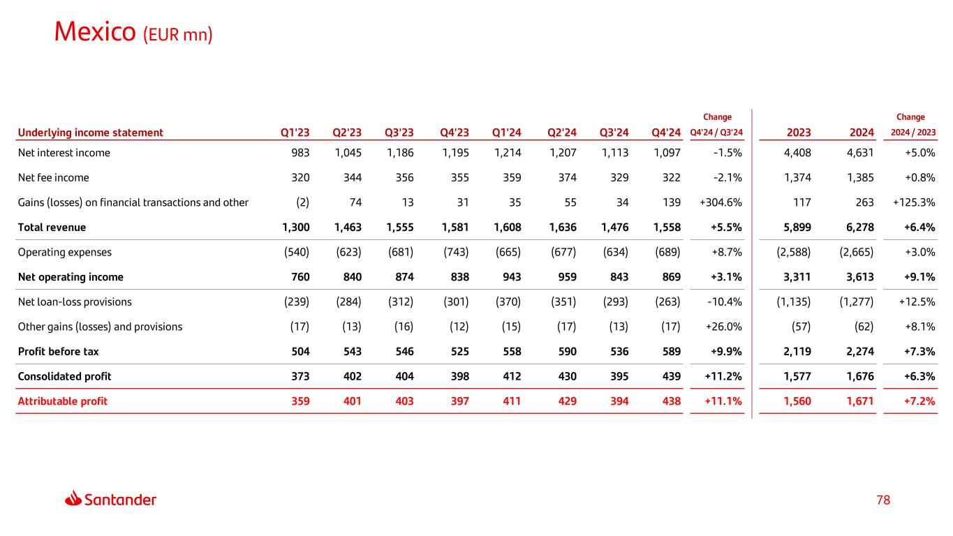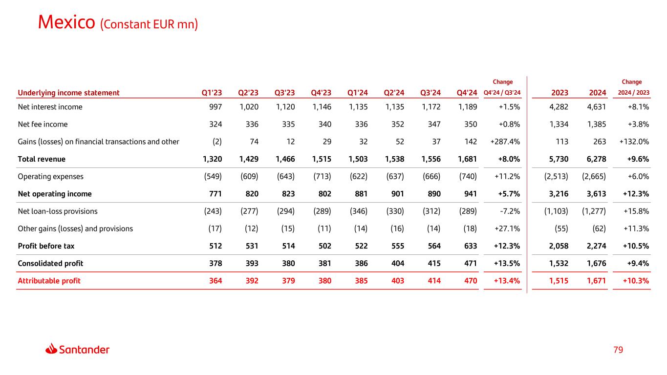 78 Mexico (EUR mn) Change Change Underlying income statement Q1'23 Q2'23 Q3'23 Q4'23 Q1'24 Q2'24 Q3'24 Q4'24 Q4'24 / Q3'24 2023 2024 2024 / 2023 Net interest income 983 1,045 1,186 1,195 1,214 1,207 1,113 1,097 -1.5% 4,408 4,631 +5.0% Net fee income 320 344 356 355 359 374 329 322 -2.1% 1,374 1,385 +0.8% Gains (losses) on financial transactions and other (2) 74 13 31 35 55 34 139 +304.6% 117 263 +125.3% Total revenue 1,300 1,463 1,555 1,581 1,608 1,636 1,476 1,558 +5.5% 5,899 6,278 +6.4% Operating expenses (540) (623) (681) (743) (665) (677) (634) (689) +8.7% (2,588) (2,665) +3.0% Net operating income 760 840 874 838 943 959 843 869 +3.1% 3,311 3,613 +9.1% Net loan-loss provisions (239) (284) (312) (301) (370) (351) (293) (263) -10.4% (1,135) (1,277) +12.5% Other gains (losses) and provisions (17) (13) (16) (12) (15) (17) (13) (17) +26.0% (57) (62) +8.1% Profit before tax 504 543 546 525 558 590 536 589 +9.9% 2,119 2,274 +7.3% Consolidated profit 373 402 404 398 412 430 395 439 +11.2% 1,577 1,676 +6.3% Attributable profit 359 401 403 397 411 429 394 438 +11.1% 1,560 1,671 +7.2%