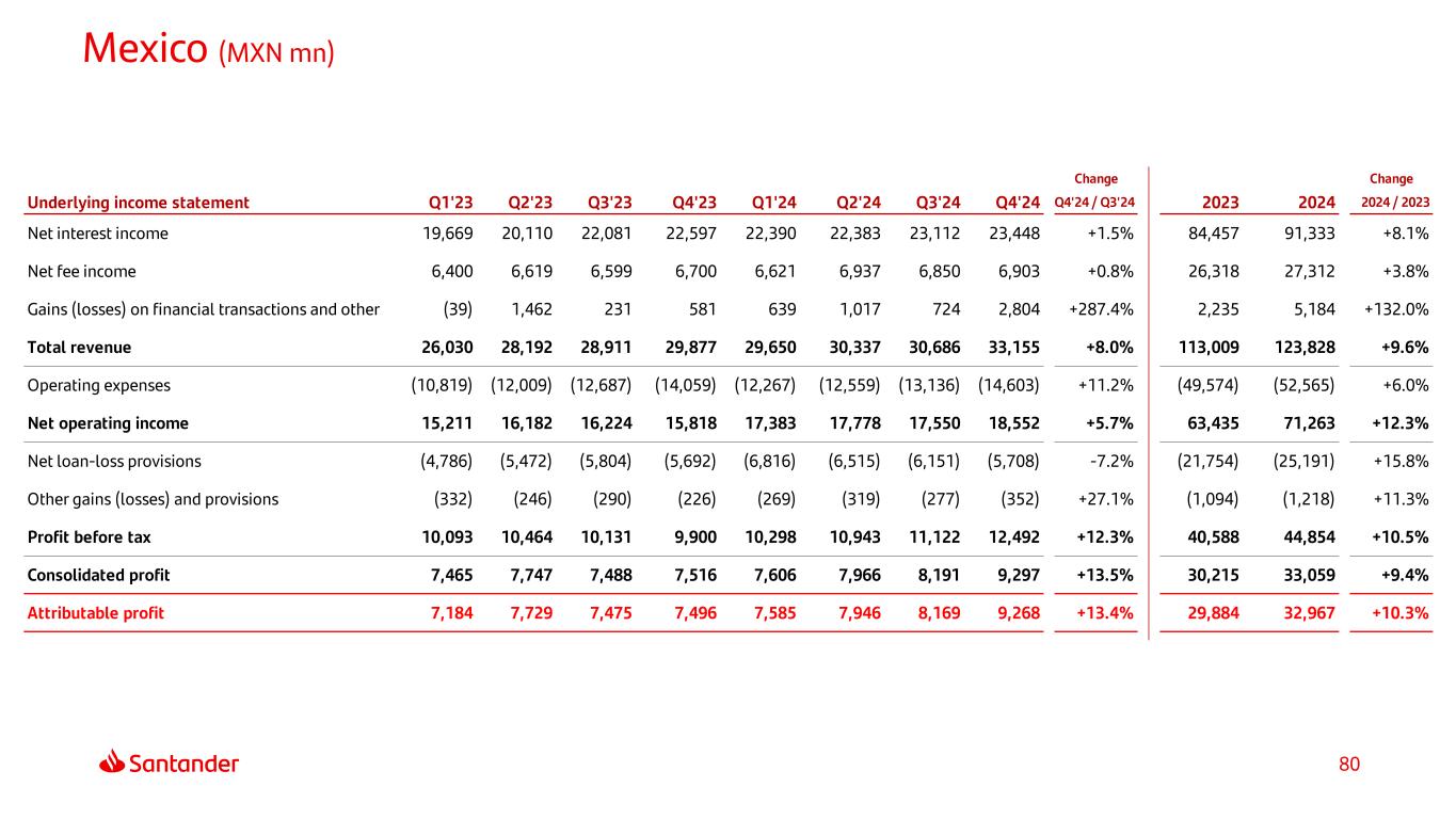 79 Mexico (Constant EUR mn) Change Change Underlying income statement Q1'23 Q2'23 Q3'23 Q4'23 Q1'24 Q2'24 Q3'24 Q4'24 Q4'24 / Q3'24 2023 2024 2024 / 2023 Net interest income 997 1,020 1,120 1,146 1,135 1,135 1,172 1,189 +1.5% 4,282 4,631 +8.1% Net fee income 324 336 335 340 336 352 347 350 +0.8% 1,334 1,385 +3.8% Gains (losses) on financial transactions and other (2) 74 12 29 32 52 37 142 +287.4% 113 263 +132.0% Total revenue 1,320 1,429 1,466 1,515 1,503 1,538 1,556 1,681 +8.0% 5,730 6,278 +9.6% Operating expenses (549) (609) (643) (713) (622) (637) (666) (740) +11.2% (2,513) (2,665) +6.0% Net operating income 771 820 823 802 881 901 890 941 +5.7% 3,216 3,613 +12.3% Net loan-loss provisions (243) (277) (294) (289) (346) (330) (312) (289) -7.2% (1,103) (1,277) +15.8% Other gains (losses) and provisions (17) (12) (15) (11) (14) (16) (14) (18) +27.1% (55) (62) +11.3% Profit before tax 512 531 514 502 522 555 564 633 +12.3% 2,058 2,274 +10.5% Consolidated profit 378 393 380 381 386 404 415 471 +13.5% 1,532 1,676 +9.4% Attributable profit 364 392 379 380 385 403 414 470 +13.4% 1,515 1,671 +10.3%