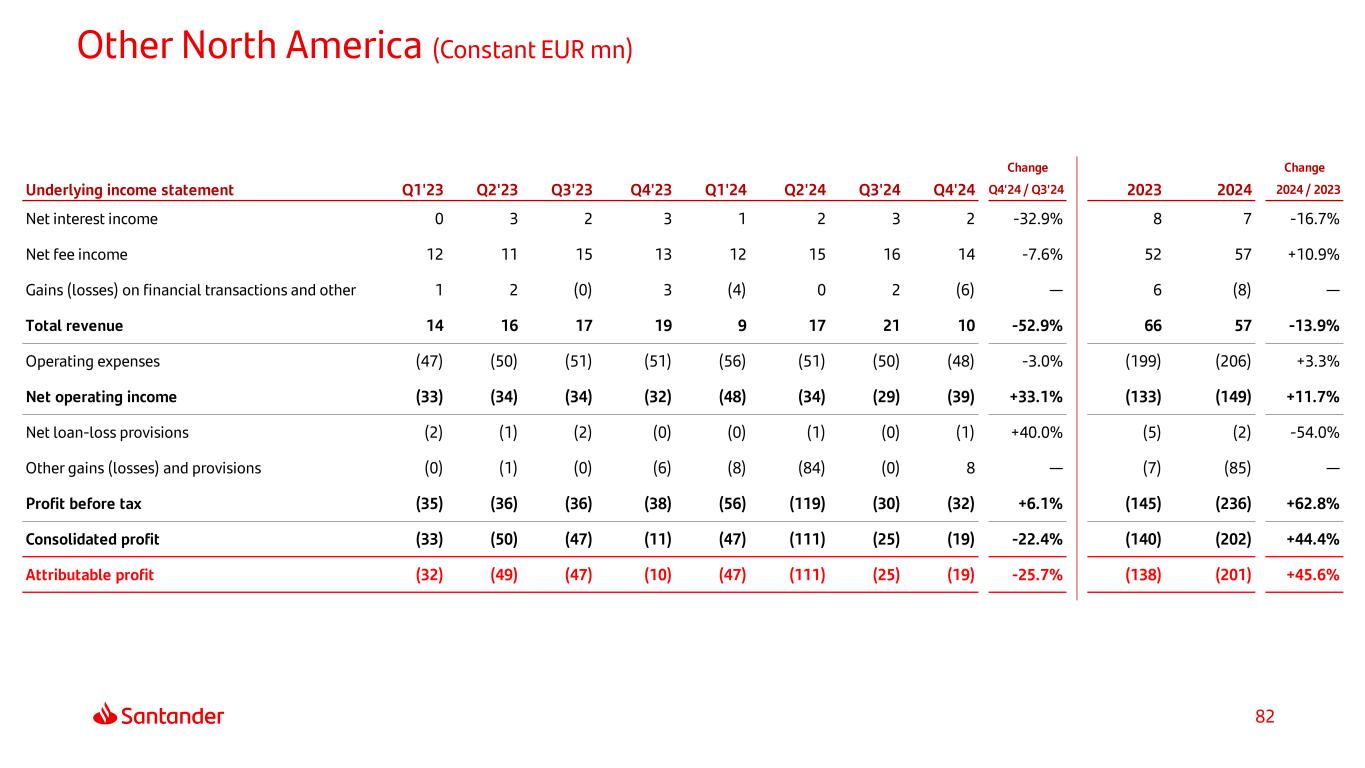 81 Other North America (EUR mn) Change Change Underlying income statement Q1'23 Q2'23 Q3'23 Q4'23 Q1'24 Q2'24 Q3'24 Q4'24 Q4'24 / Q3'24 2023 2024 2024 / 2023 Net interest income 0 3 2 3 1 2 3 2 -33.4% 8 7 -16.7% Net fee income 12 11 15 13 12 15 16 14 -7.7% 52 57 +10.9% Gains (losses) on financial transactions and other 1 2 (0) 3 (4) 0 3 (7) — 6 (8) — Total revenue 14 16 17 19 9 17 21 10 -53.4% 66 57 -13.9% Operating expenses (47) (50) (51) (51) (56) (51) (50) (48) -3.0% (199) (206) +3.3% Net operating income (33) (34) (34) (32) (48) (34) (29) (39) +33.7% (133) (149) +11.7% Net loan-loss provisions (2) (1) (2) (0) (0) (1) (0) (1) +40.0% (5) (2) -54.0% Other gains (losses) and provisions (0) (1) (0) (6) (8) (84) (0) 8 — (7) (85) — Profit before tax (35) (36) (36) (38) (56) (119) (30) (32) +6.8% (145) (236) +62.8% Consolidated profit (33) (50) (47) (11) (47) (111) (25) (19) -21.7% (140) (202) +44.4% Attributable profit (32) (49) (47) (10) (47) (111) (25) (19) -25.0% (138) (201) +45.5%