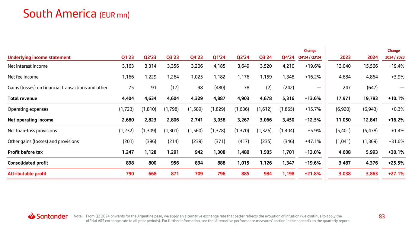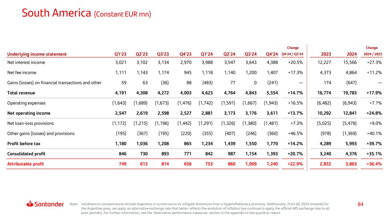 83 South America (EUR mn) Change Change Underlying income statement Q1'23 Q2'23 Q3'23 Q4'23 Q1'24 Q2'24 Q3'24 Q4'24 Q4'24 / Q3'24 2023 2024 2024 / 2023 Net interest income 3,163 3,314 3,356 3,206 4,185 3,649 3,520 4,210 +19.6% 13,040 15,566 +19.4% Net fee income 1,166 1,229 1,264 1,025 1,182 1,176 1,159 1,348 +16.2% 4,684 4,864 +3.9% Gains (losses) on financial transactions and other 75 91 (17) 98 (480) 78 (2) (242) — 247 (647) — Total revenue 4,404 4,634 4,604 4,329 4,887 4,903 4,678 5,316 +13.6% 17,971 19,783 +10.1% Operating expenses (1,723) (1,810) (1,798) (1,589) (1,829) (1,636) (1,612) (1,865) +15.7% (6,920) (6,943) +0.3% Net operating income 2,680 2,823 2,806 2,741 3,058 3,267 3,066 3,450 +12.5% 11,050 12,841 +16.2% Net loan-loss provisions (1,232) (1,309) (1,301) (1,560) (1,378) (1,370) (1,326) (1,404) +5.9% (5,401) (5,478) +1.4% Other gains (losses) and provisions (201) (386) (214) (239) (371) (417) (235) (346) +47.1% (1,041) (1,369) +31.6% Profit before tax 1,247 1,128 1,291 942 1,308 1,480 1,505 1,701 +13.0% 4,608 5,993 +30.1% Consolidated profit 898 800 956 834 888 1,015 1,126 1,347 +19.6% 3,487 4,376 +25.5% Attributable profit 790 668 871 709 796 885 984 1,198 +21.8% 3,038 3,863 +27.1% Note: From Q2 2024 onwards for the Argentine peso, we apply an alternative exchange rate that better reflects the evolution of inflation (we continue to apply the official ARS exchange rate to all prior periods). For further information, see the 'Alternative performance measures' section in the appendix to the quarterly report.