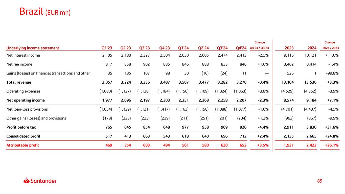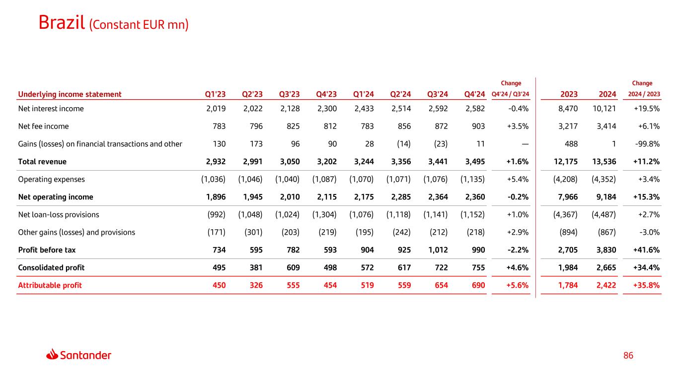 85 Brazil (EUR mn) Change Change Underlying income statement Q1'23 Q2'23 Q3'23 Q4'23 Q1'24 Q2'24 Q3'24 Q4'24 Q4'24 / Q3'24 2023 2024 2024 / 2023 Net interest income 2,105 2,180 2,327 2,504 2,630 2,605 2,474 2,413 -2.5% 9,116 10,121 +11.0% Net fee income 817 858 902 885 846 888 833 846 +1.6% 3,462 3,414 -1.4% Gains (losses) on financial transactions and other 135 185 107 98 30 (16) (24) 11 — 526 1 -99.8% Total revenue 3,057 3,224 3,336 3,487 3,507 3,477 3,282 3,270 -0.4% 13,104 13,536 +3.3% Operating expenses (1,080) (1,127) (1,138) (1,184) (1,156) (1,109) (1,024) (1,063) +3.8% (4,529) (4,352) -3.9% Net operating income 1,977 2,096 2,197 2,303 2,351 2,368 2,258 2,207 -2.3% 8,574 9,184 +7.1% Net loan-loss provisions (1,034) (1,129) (1,121) (1,417) (1,163) (1,158) (1,088) (1,077) -1.0% (4,701) (4,487) -4.5% Other gains (losses) and provisions (178) (323) (223) (239) (211) (251) (201) (204) +1.2% (963) (867) -9.9% Profit before tax 765 645 854 648 977 958 969 926 -4.4% 2,911 3,830 +31.6% Consolidated profit 517 413 663 543 618 640 696 712 +2.4% 2,135 2,665 +24.8% Attributable profit 469 354 603 494 561 580 630 652 +3.5% 1,921 2,422 +26.1%
