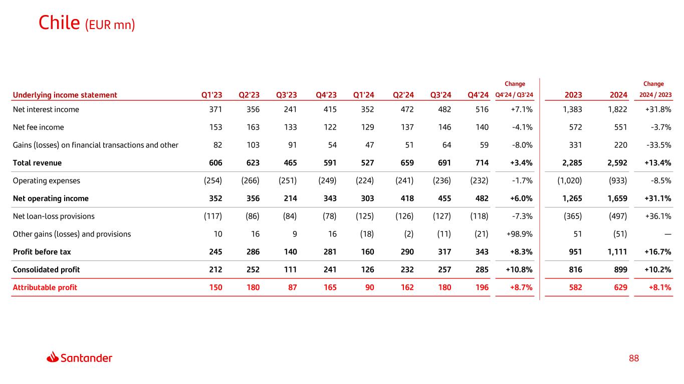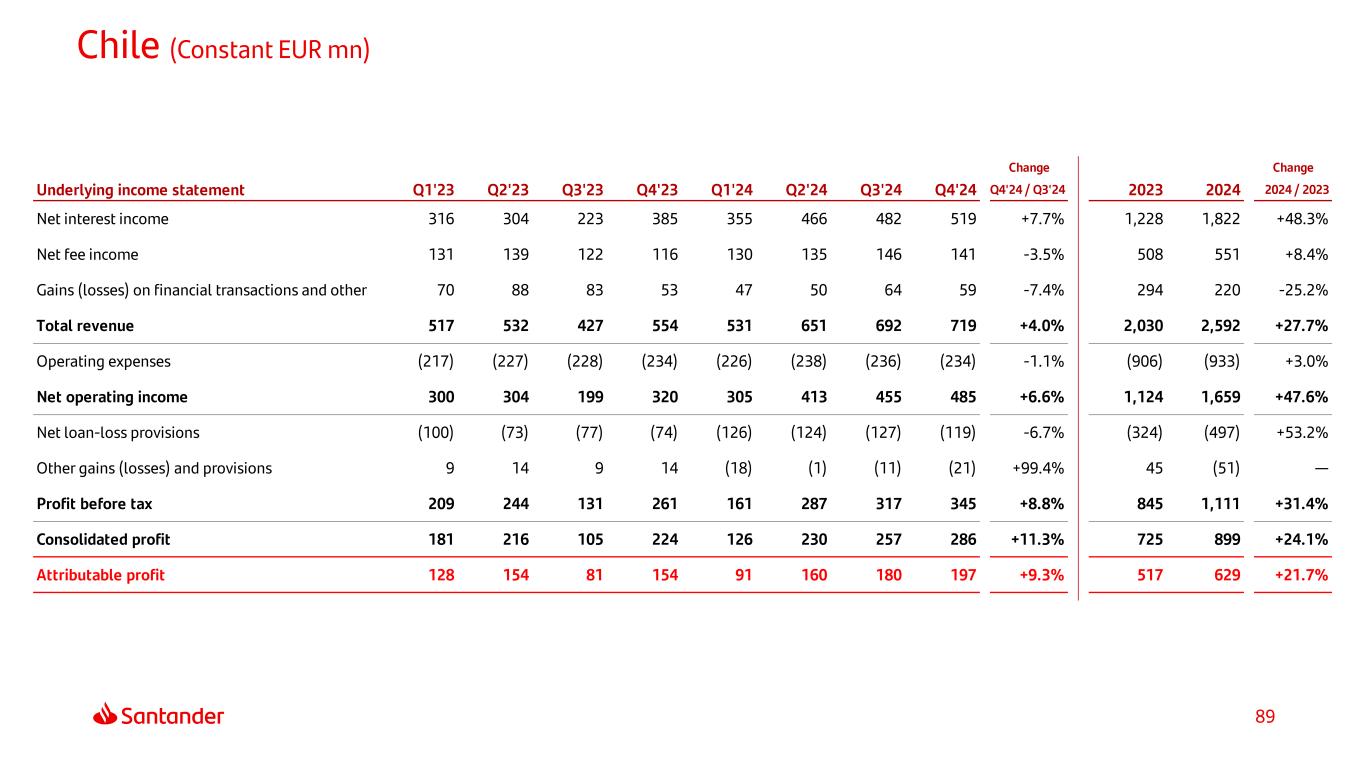 88 Chile (EUR mn) Change Change Underlying income statement Q1'23 Q2'23 Q3'23 Q4'23 Q1'24 Q2'24 Q3'24 Q4'24 Q4'24 / Q3'24 2023 2024 2024 / 2023 Net interest income 371 356 241 415 352 472 482 516 +7.1% 1,383 1,822 +31.8% Net fee income 153 163 133 122 129 137 146 140 -4.1% 572 551 -3.7% Gains (losses) on financial transactions and other 82 103 91 54 47 51 64 59 -8.0% 331 220 -33.5% Total revenue 606 623 465 591 527 659 691 714 +3.4% 2,285 2,592 +13.4% Operating expenses (254) (266) (251) (249) (224) (241) (236) (232) -1.7% (1,020) (933) -8.5% Net operating income 352 356 214 343 303 418 455 482 +6.0% 1,265 1,659 +31.1% Net loan-loss provisions (117) (86) (84) (78) (125) (126) (127) (118) -7.3% (365) (497) +36.1% Other gains (losses) and provisions 10 16 9 16 (18) (2) (11) (21) +98.9% 51 (51) — Profit before tax 245 286 140 281 160 290 317 343 +8.3% 951 1,111 +16.7% Consolidated profit 212 252 111 241 126 232 257 285 +10.8% 816 899 +10.2% Attributable profit 150 180 87 165 90 162 180 196 +8.7% 582 629 +8.1%