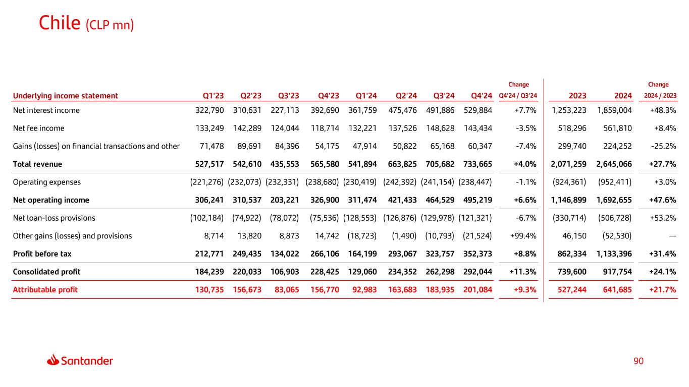 90 Chile (CLP mn) Change Change Underlying income statement Q1'23 Q2'23 Q3'23 Q4'23 Q1'24 Q2'24 Q3'24 Q4'24 Q4'24 / Q3'24 2023 2024 2024 / 2023 Net interest income 322,790 310,631 227,113 392,690 361,759 475,476 491,886 529,884 +7.7% 1,253,223 1,859,004 +48.3% Net fee income 133,249 142,289 124,044 118,714 132,221 137,526 148,628 143,434 -3.5% 518,296 561,810 +8.4% Gains (losses) on financial transactions and other 71,478 89,691 84,396 54,175 47,914 50,822 65,168 60,347 -7.4% 299,740 224,252 -25.2% Total revenue 527,517 542,610 435,553 565,580 541,894 663,825 705,682 733,665 +4.0% 2,071,259 2,645,066 +27.7% Operating expenses (221,276) (232,073) (232,331) (238,680) (230,419) (242,392) (241,154) (238,447) -1.1% (924,361) (952,411) +3.0% Net operating income 306,241 310,537 203,221 326,900 311,474 421,433 464,529 495,219 +6.6% 1,146,899 1,692,655 +47.6% Net loan-loss provisions (102,184) (74,922) (78,072) (75,536) (128,553) (126,876) (129,978) (121,321) -6.7% (330,714) (506,728) +53.2% Other gains (losses) and provisions 8,714 13,820 8,873 14,742 (18,723) (1,490) (10,793) (21,524) +99.4% 46,150 (52,530) — Profit before tax 212,771 249,435 134,022 266,106 164,199 293,067 323,757 352,373 +8.8% 862,334 1,133,396 +31.4% Consolidated profit 184,239 220,033 106,903 228,425 129,060 234,352 262,298 292,044 +11.3% 739,600 917,754 +24.1% Attributable profit 130,735 156,673 83,065 156,770 92,983 163,683 183,935 201,084 +9.3% 527,244 641,685 +21.7%