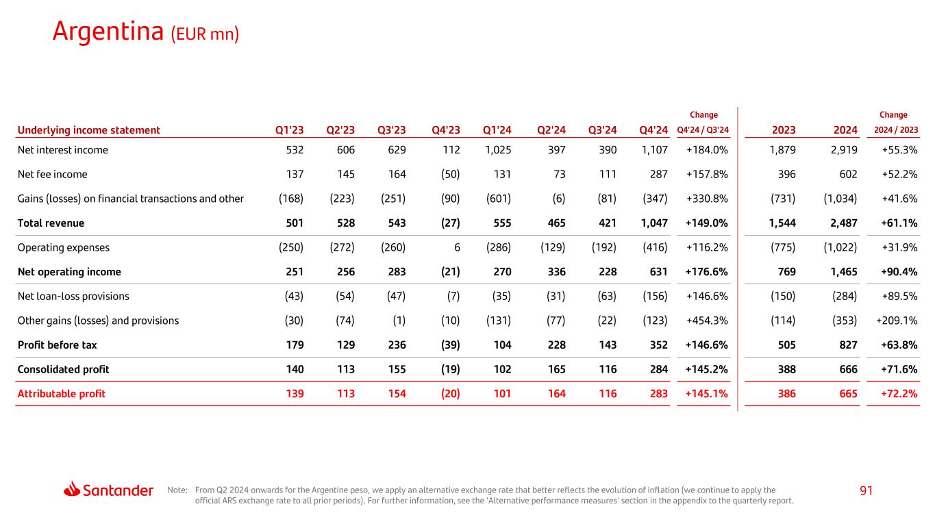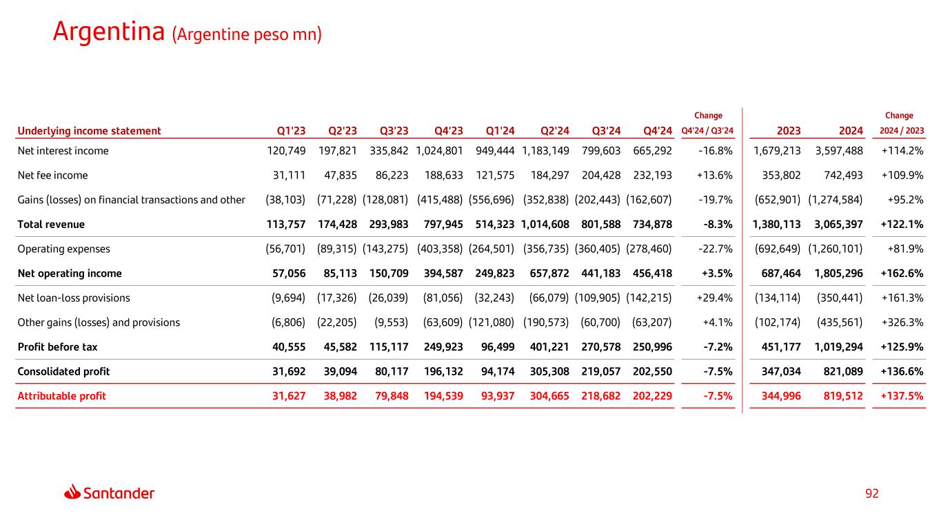 91 Argentina (EUR mn) Change Change Underlying income statement Q1'23 Q2'23 Q3'23 Q4'23 Q1'24 Q2'24 Q3'24 Q4'24 Q4'24 / Q3'24 2023 2024 2024 / 2023 Net interest income 532 606 629 112 1,025 397 390 1,107 +184.0% 1,879 2,919 +55.3% Net fee income 137 145 164 (50) 131 73 111 287 +157.8% 396 602 +52.2% Gains (losses) on financial transactions and other (168) (223) (251) (90) (601) (6) (81) (347) +330.8% (731) (1,034) +41.6% Total revenue 501 528 543 (27) 555 465 421 1,047 +149.0% 1,544 2,487 +61.1% Operating expenses (250) (272) (260) 6 (286) (129) (192) (416) +116.2% (775) (1,022) +31.9% Net operating income 251 256 283 (21) 270 336 228 631 +176.6% 769 1,465 +90.4% Net loan-loss provisions (43) (54) (47) (7) (35) (31) (63) (156) +146.6% (150) (284) +89.5% Other gains (losses) and provisions (30) (74) (1) (10) (131) (77) (22) (123) +454.3% (114) (353) +209.1% Profit before tax 179 129 236 (39) 104 228 143 352 +146.6% 505 827 +63.8% Consolidated profit 140 113 155 (19) 102 165 116 284 +145.2% 388 666 +71.6% Attributable profit 139 113 154 (20) 101 164 116 283 +145.1% 386 665 +72.2% Note: From Q2 2024 onwards for the Argentine peso, we apply an alternative exchange rate that better reflects the evolution of inflation (we continue to apply the official ARS exchange rate to all prior periods). For further information, see the 'Alternative performance measures' section in the appendix to the quarterly report.