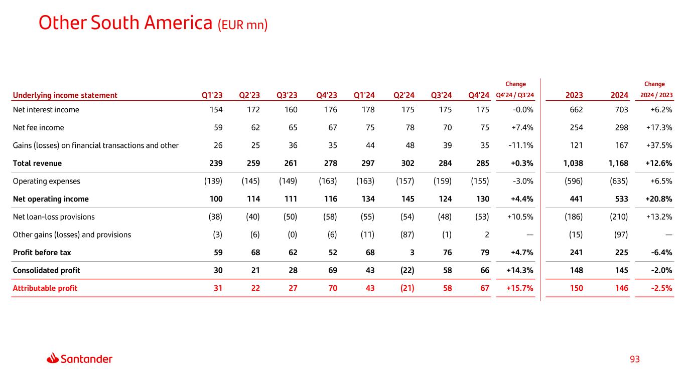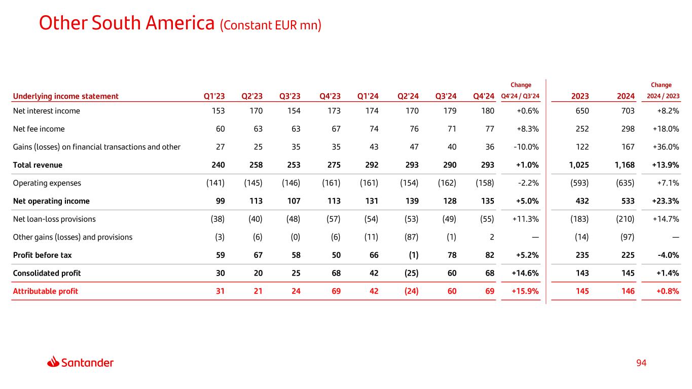 93 Other South America (EUR mn) Change Change Underlying income statement Q1'23 Q2'23 Q3'23 Q4'23 Q1'24 Q2'24 Q3'24 Q4'24 Q4'24 / Q3'24 2023 2024 2024 / 2023 Net interest income 154 172 160 176 178 175 175 175 -0.0% 662 703 +6.2% Net fee income 59 62 65 67 75 78 70 75 +7.4% 254 298 +17.3% Gains (losses) on financial transactions and other 26 25 36 35 44 48 39 35 -11.1% 121 167 +37.5% Total revenue 239 259 261 278 297 302 284 285 +0.3% 1,038 1,168 +12.6% Operating expenses (139) (145) (149) (163) (163) (157) (159) (155) -3.0% (596) (635) +6.5% Net operating income 100 114 111 116 134 145 124 130 +4.4% 441 533 +20.8% Net loan-loss provisions (38) (40) (50) (58) (55) (54) (48) (53) +10.5% (186) (210) +13.2% Other gains (losses) and provisions (3) (6) (0) (6) (11) (87) (1) 2 — (15) (97) — Profit before tax 59 68 62 52 68 3 76 79 +4.7% 241 225 -6.4% Consolidated profit 30 21 28 69 43 (22) 58 66 +14.3% 148 145 -2.0% Attributable profit 31 22 27 70 43 (21) 58 67 +15.7% 150 146 -2.5%