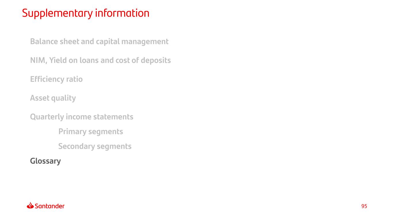 95 Supplementary information Balance sheet and capital management NIM, Yield on loans and cost of deposits Efficiency ratio Asset quality Quarterly income statements Primary segments Secondary segments Glossary