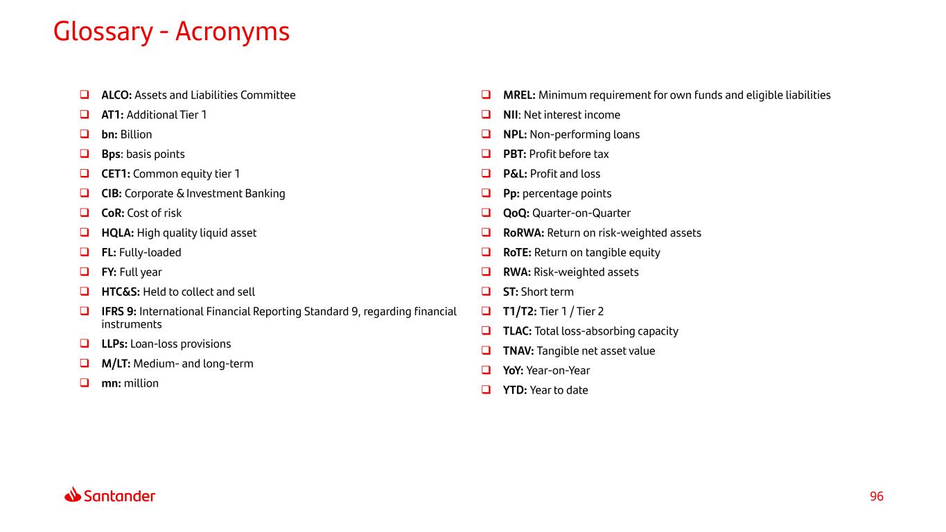 96 Glossary - Acronyms ❑ ALCO: Assets and Liabilities Committee ❑ AT1: Additional Tier 1 ❑ bn: Billion ❑ Bps: basis points ❑ CET1: Common equity tier 1 ❑ CIB: Corporate & Investment Banking ❑ CoR: Cost of risk ❑ HQLA: High quality liquid asset ❑ FL: Fully-loaded ❑ FY: Full year ❑ HTC&S: Held to collect and sell ❑ IFRS 9: International Financial Reporting Standard 9, regarding financial instruments ❑ LLPs: Loan-loss provisions ❑ M/LT: Medium- and long-term ❑ mn: million ❑ MREL: Minimum requirement for own funds and eligible liabilities ❑ NII: Net interest income ❑ NPL: Non-performing loans ❑ PBT: Profit before tax ❑ P&L: Profit and loss ❑ Pp: percentage points ❑ QoQ: Quarter-on-Quarter ❑ RoRWA: Return on risk-weighted assets ❑ RoTE: Return on tangible equity ❑ RWA: Risk-weighted assets ❑ ST: Short term ❑ T1/T2: Tier 1 / Tier 2 ❑ TLAC: Total loss-absorbing capacity ❑ TNAV: Tangible net asset value ❑ YoY: Year-on-Year ❑ YTD: Year to date