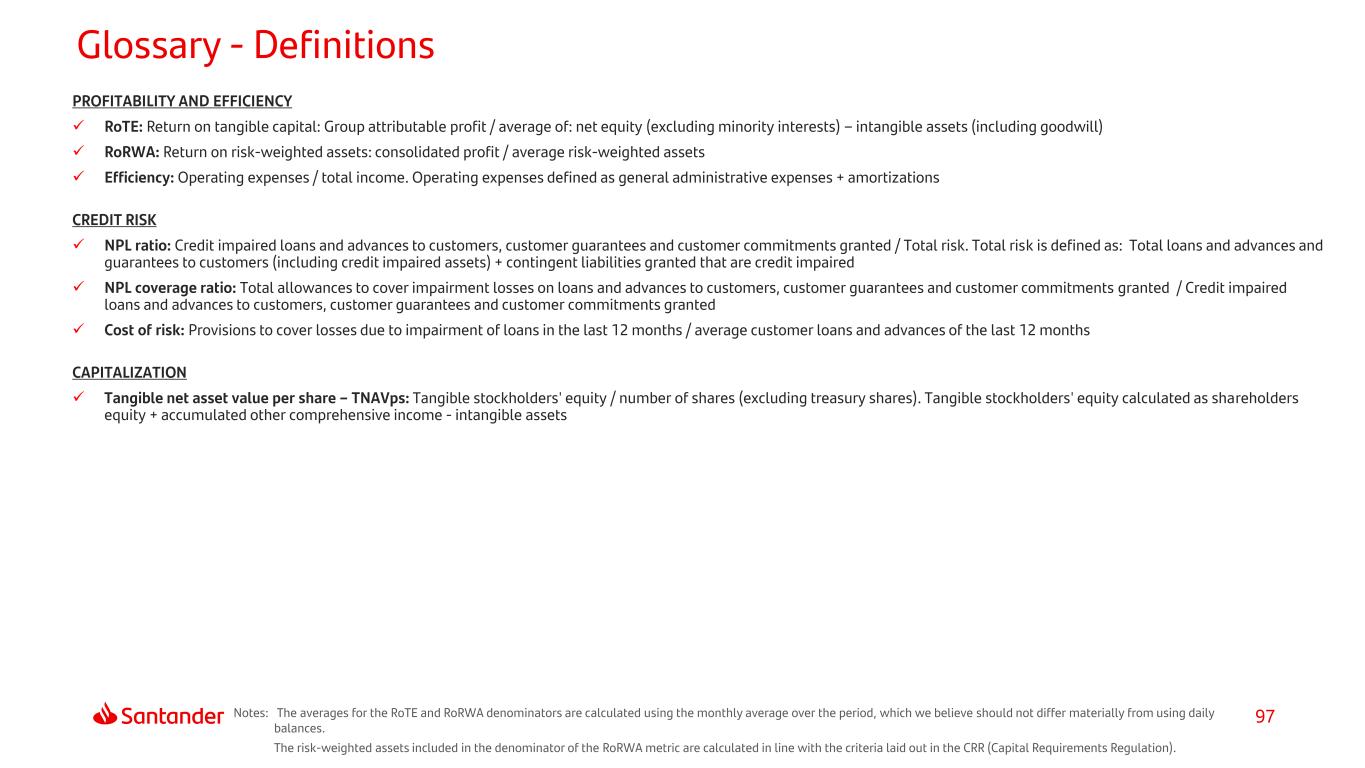 97 Glossary - Definitions PROFITABILITY AND EFFICIENCY ✓ RoTE: Return on tangible capital: Group attributable profit / average of: net equity (excluding minority interests) – intangible assets (including goodwill) ✓ RoRWA: Return on risk-weighted assets: consolidated profit / average risk-weighted assets ✓ Efficiency: Operating expenses / total income. Operating expenses defined as general administrative expenses + amortizations CREDIT RISK ✓ NPL ratio: Credit impaired loans and advances to customers, customer guarantees and customer commitments granted / Total risk. Total risk is defined as: Total loans and advances and guarantees to customers (including credit impaired assets) + contingent liabilities granted that are credit impaired ✓ NPL coverage ratio: Total allowances to cover impairment losses on loans and advances to customers, customer guarantees and customer commitments granted / Credit impaired loans and advances to customers, customer guarantees and customer commitments granted ✓ Cost of risk: Provisions to cover losses due to impairment of loans in the last 12 months / average customer loans and advances of the last 12 months CAPITALIZATION ✓ Tangible net asset value per share – TNAVps: Tangible stockholders' equity / number of shares (excluding treasury shares). Tangible stockholders' equity calculated as shareholders equity + accumulated other comprehensive income - intangible assets Notes: The averages for the RoTE and RoRWA denominators are calculated using the monthly average over the period, which we believe should not differ materially from using daily balances. The risk-weighted assets included in the denominator of the RoRWA metric are calculated in line with the criteria laid out in the CRR (Capital Requirements Regulation).