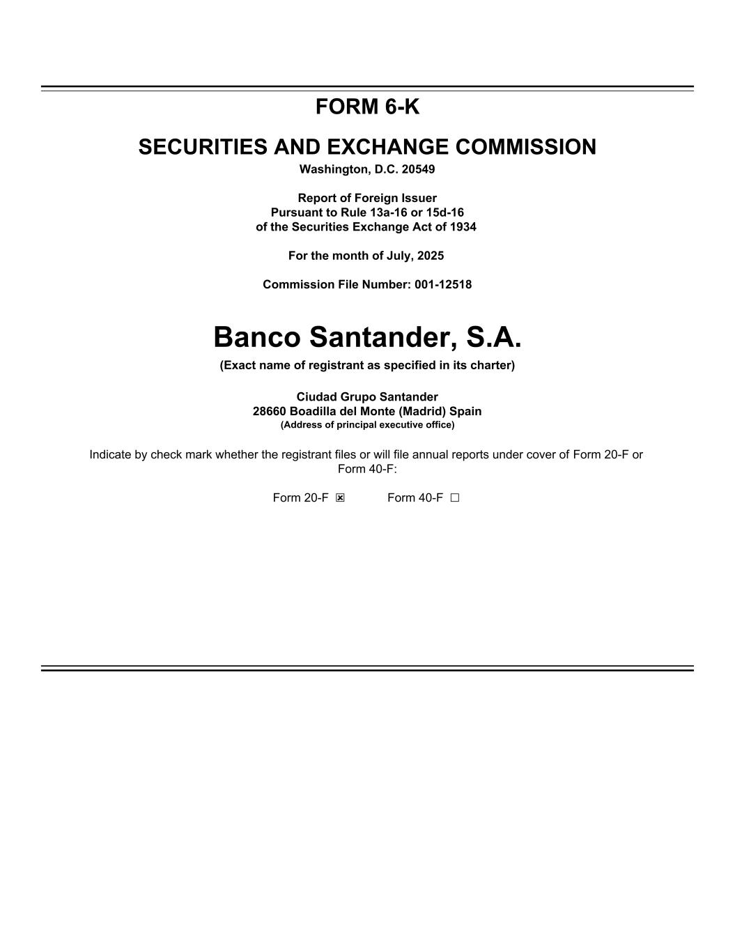 FORM 6-K SECURITIES AND EXCHANGE COMMISSION Washington, D.C. 20549 Report of Foreign Issuer Pursuant to Rule 13a-16 or 15d-16 of the Securities Exchange Act of 1934 For the month of July, 2025 Commission File Number: 001-12518 Banco Santander, S.A. (Exact name of registrant as specified in its charter) Ciudad Grupo Santander 28660 Boadilla del Monte (Madrid) Spain (Address of principal executive office) Indicate by check mark whether the registrant files or will file annual reports under cover of Form 20-F or Form 40-F: Form 20-F ☒ Form 40-F ☐