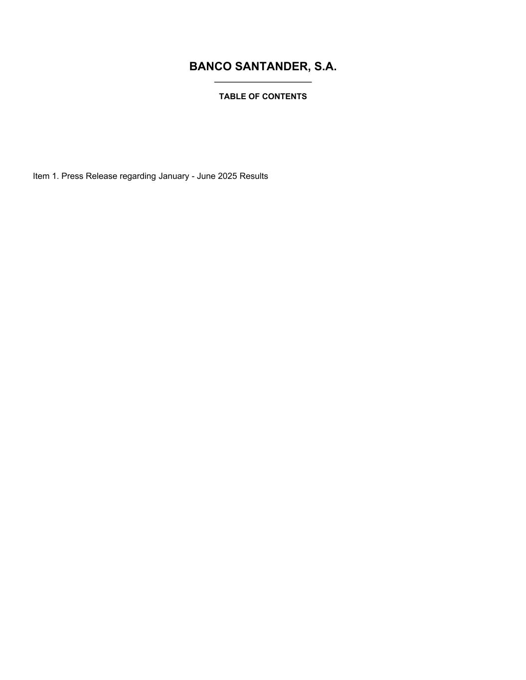BANCO SANTANDER, S.A. ________________________ TABLE OF CONTENTS Item 1. Press Release regarding January - June 2025 Results