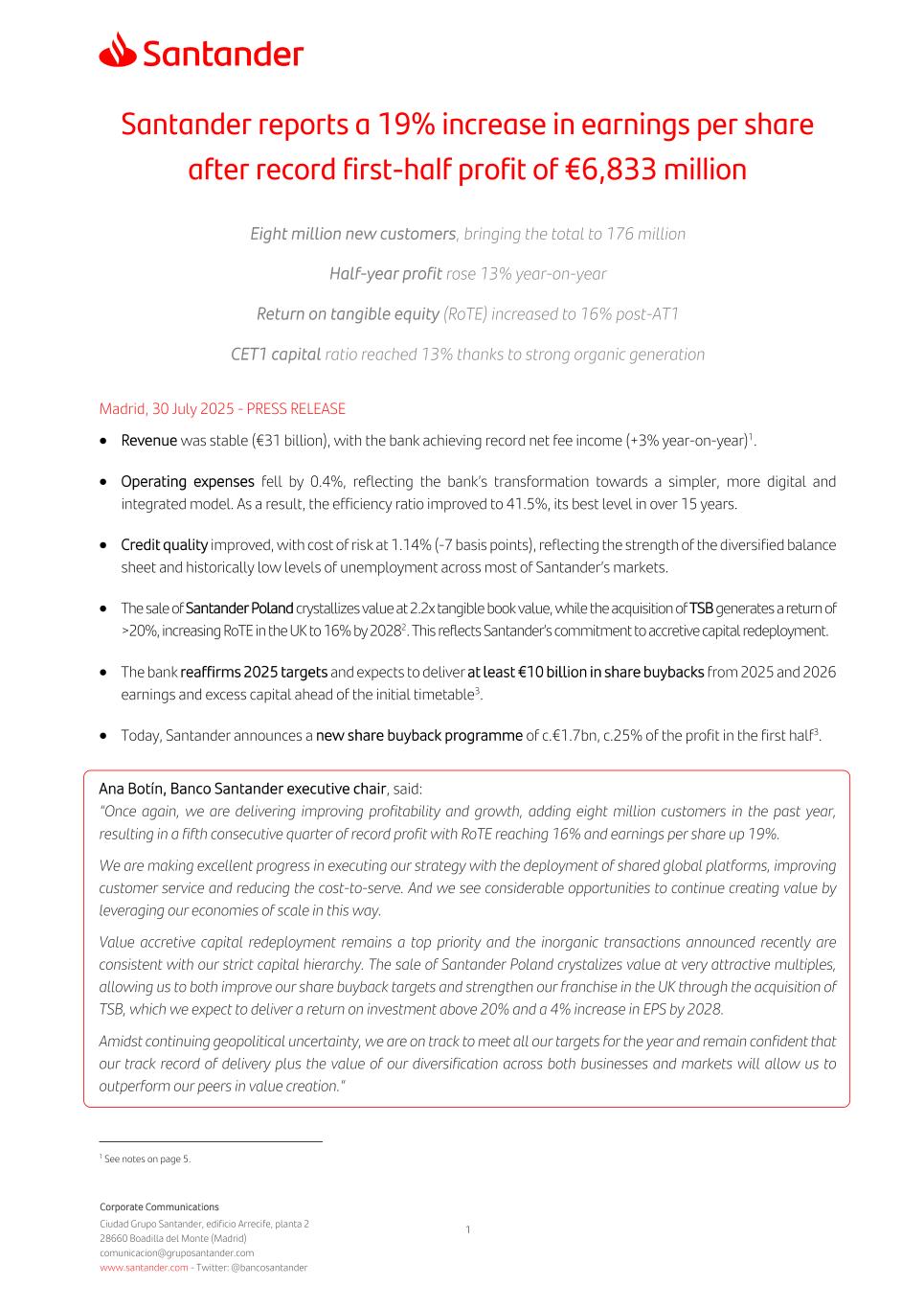 Corporate Communications Ciudad Grupo Santander, edificio Arrecife, planta 2 28660 Boadilla del Monte (Madrid) comunicacion@gruposantander.com www.santander.com - Twitter: @bancosantander 1 Santander reports a 19% increase in earnings per share after record first-half profit of €6,833 million Eight million new customers, bringing the total to 176 million Half-year profit rose 13% year-on-year Return on tangible equity (RoTE) increased to 16% post-AT1 CET1 capital ratio reached 13% thanks to strong organic generation Madrid, 30 July 2025 - PRESS RELEASE • Revenue was stable (€31 billion), with the bank achieving record net fee income (+3% year-on-year)1.1 • Operating expenses fell by 0.4%, reflecting the bank’s transformation towards a simpler, more digital and integrated model. As a result, the efficiency ratio improved to 41.5%, its best level in over 15 years. • Credit quality improved, with cost of risk at 1.14% (-7 basis points), reflecting the strength of the diversified balance sheet and historically low levels of unemployment across most of Santander’s markets. • The sale of Santander Poland crystallizes value at 2.2x tangible book value, while the acquisition of TSB generates a return of >20%, increasing RoTE in the UK to 16% by 20282. This reflects Santander’s commitment to accretive capital redeployment. • The bank reaffirms 2025 targets and expects to deliver at least €10 billion in share buybacks from 2025 and 2026 earnings and excess capital ahead of the initial timetable3. • Today, Santander announces a new share buyback programme of c.€1.7bn, c.25% of the profit in the first half3. Ana Botín, Banco Santander executive chair, said: “Once again, we are delivering improving profitability and growth, adding eight million customers in the past year, resulting in a fifth consecutive quarter of record profit with RoTE reaching 16% and earnings per share up 19%. We are making excellent progress in executing our strategy with the deployment of shared global platforms, improving customer service and reducing the cost-to-serve. And we see considerable opportunities to continue creating value by leveraging our economies of scale in this way. Value accretive capital redeployment remains a top priority and the inorganic transactions announced recently are consistent with our strict capital hierarchy. The sale of Santander Poland crystalizes value at very attractive multiples, allowing us to both improve our share buyback targets and strengthen our franchise in the UK through the acquisition of TSB, which we expect to deliver a return on investment above 20% and a 4% increase in EPS by 2028. Amidst continuing geopolitical uncertainty, we are on track to meet all our targets for the year and remain confident that our track record of delivery plus the value of our diversification across both businesses and markets will allow us to outperform our peers in value creation.” 1 See notes on page 5.
