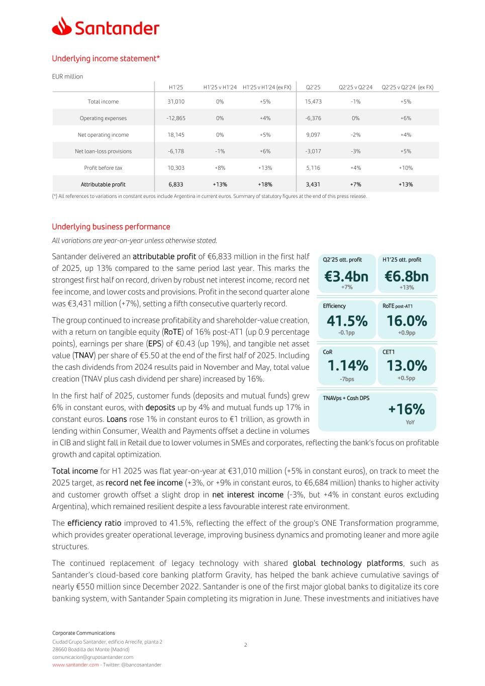 Corporate Communications Ciudad Grupo Santander, edificio Arrecife, planta 2 28660 Boadilla del Monte (Madrid) comunicacion@gruposantander.com www.santander.com - Twitter: @bancosantander 2 Underlying income statement* EUR million H1’25 H1’25 v H1’24 H1’25 v H1’24 (ex FX) Q2’25 Q2’25 v Q2’24 Q2’25 v Q2’24 (ex FX) Total income 31,010 0% +5% 15,473 -1% +5% Operating expenses -12,865 0% +4% -6,376 0% +6% Net operating income 18,145 0% +5% 9,097 -2% +4% Net loan-loss provisions -6,178 -1% +6% -3,017 -3% +5% Profit before tax 10,303 +8% +13% 5,116 +4% +10% Attributable profit 6,833 +13% +18% 3,431 +7% +13% (*) All references to variations in constant euros include Argentina in current euros. Summary of statutory figures at the end of this press release. Underlying business performance All variations are year-on-year unless otherwise stated. Santander delivered an attributable profit of €6,833 million in the first half of 2025, up 13% compared to the same period last year. This marks the strongest first half on record, driven by robust net interest income, record net fee income, and lower costs and provisions. Profit in the second quarter alone was €3,431 million (+7%), setting a fifth consecutive quarterly record. The group continued to increase profitability and shareholder-value creation, with a return on tangible equity (RoTE) of 16% post-AT1 (up 0.9 percentage points), earnings per share (EPS) of €0.43 (up 19%), and tangible net asset value (TNAV) per share of €5.50 at the end of the first half of 2025. Including the cash dividends from 2024 results paid in November and May, total value creation (TNAV plus cash dividend per share) increased by 16%. In the first half of 2025, customer funds (deposits and mutual funds) grew 6% in constant euros, with deposits up by 4% and mutual funds up 17% in constant euros. Loans rose 1% in constant euros to €1 trillion, as growth in lending within Consumer, Wealth and Payments offset a decline in volumes in CIB and slight fall in Retail due to lower volumes in SMEs and corporates, reflecting the bank’s focus on profitable growth and capital optimization. Total income for H1 2025 was flat year-on-year at €31,010 million (+5% in constant euros), on track to meet the 2025 target, as record net fee income (+3%, or +9% in constant euros, to €6,684 million) thanks to higher activity and customer growth offset a slight drop in net interest income (-3%, but +4% in constant euros excluding Argentina), which remained resilient despite a less favourable interest rate environment. The efficiency ratio improved to 41.5%, reflecting the effect of the group’s ONE Transformation programme, which provides greater operational leverage, improving business dynamics and promoting leaner and more agile structures. The continued replacement of legacy technology with shared global technology platforms, such as Santander’s cloud-based core banking platform Gravity, has helped the bank achieve cumulative savings of nearly €550 million since December 2022. Santander is one of the first major global banks to digitalize its core banking system, with Santander Spain completing its migration in June. These investments and initiatives have