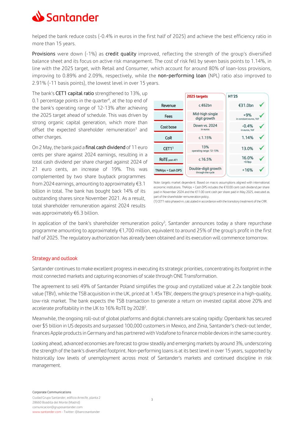 Corporate Communications Ciudad Grupo Santander, edificio Arrecife, planta 2 28660 Boadilla del Monte (Madrid) comunicacion@gruposantander.com www.santander.com - Twitter: @bancosantander 3 helped the bank reduce costs (-0.4% in euros in the first half of 2025) and achieve the best efficiency ratio in more than 15 years. Provisions were down (-1%) as credit quality improved, reflecting the strength of the group’s diversified balance sheet and its focus on active risk management. The cost of risk fell by seven basis points to 1.14%, in line with the 2025 target, with Retail and Consumer, which account for around 80% of loan-loss provisions, improving to 0.89% and 2.09%, respectively, while the non-performing loan (NPL) ratio also improved to 2.91% (-11 basis points), the lowest level in over 15 years. The bank’s CET1 capital ratio strengthened to 13%, up 0.1 percentage points in the quarter4, at the top end of the bank’s operating range of 12-13% after achieving the 2025 target ahead of schedule. This was driven by strong organic capital generation, which more than offset the expected shareholder remuneration3 and other charges. On 2 May, the bank paid a final cash dividend of 11 euro cents per share against 2024 earnings, resulting in a total cash dividend per share charged against 2024 of 21 euro cents, an increase of 19%. This was complemented by two share buyback programmes from 2024 earnings, amounting to approximately €3.1 billion in total. The bank has bought back 14% of its outstanding shares since November 2021. As a result, total shareholder remuneration against 2024 results was approximately €6.3 billion. In application of the bank’s shareholder remuneration policy3, Santander announces today a share repurchase programme amounting to approximately €1,700 million, equivalent to around 25% of the group’s profit in the first half of 2025. The regulatory authorization has already been obtained and its execution will commence tomorrow. Strategy and outlook Santander continues to make excellent progress in executing its strategic priorities, concentrating its footprint in the most connected markets and capturing economies of scale through ONE Transformation. The agreement to sell 49% of Santander Poland simplifies the group and crystallized value at 2.2x tangible book value (TBV), while the TSB acquisition in the UK, priced at 1.45x TBV, deepens the group’s presence in a high-quality, low-risk market. The bank expects the TSB transaction to generate a return on invested capital above 20% and accelerate profitability in the UK to 16% RoTE by 20282. Meanwhile, the ongoing roll-out of global platforms and digital channels are scaling rapidly: Openbank has secured over $5 billion in US deposits and surpassed 100,000 customers in Mexico, and Zinia, Santander’s check-out lender, finances Apple products in Germany and has partnered with Vodafone to finance mobile devices in the same country. Looking ahead, advanced economies are forecast to grow steadily and emerging markets by around 3%, underscoring the strength of the bank’s diversified footprint. Non-performing loans is at its best level in over 15 years, supported by historically low levels of unemployment across most of Santander’s markets and continued discipline in risk management. Note: targets market dependent. Based on macro assumptions aligned with international economic institutions. TNAVps + Cash DPS includes the €10.00 cent cash dividend per share paid in November 2024 and the €11.00 cent cash per share paid in May 2025, executed as part of the shareholder remuneration policy. (1) CET1 ratio phased-in, calculated in accordance with the transitory treatment of the CRR.
