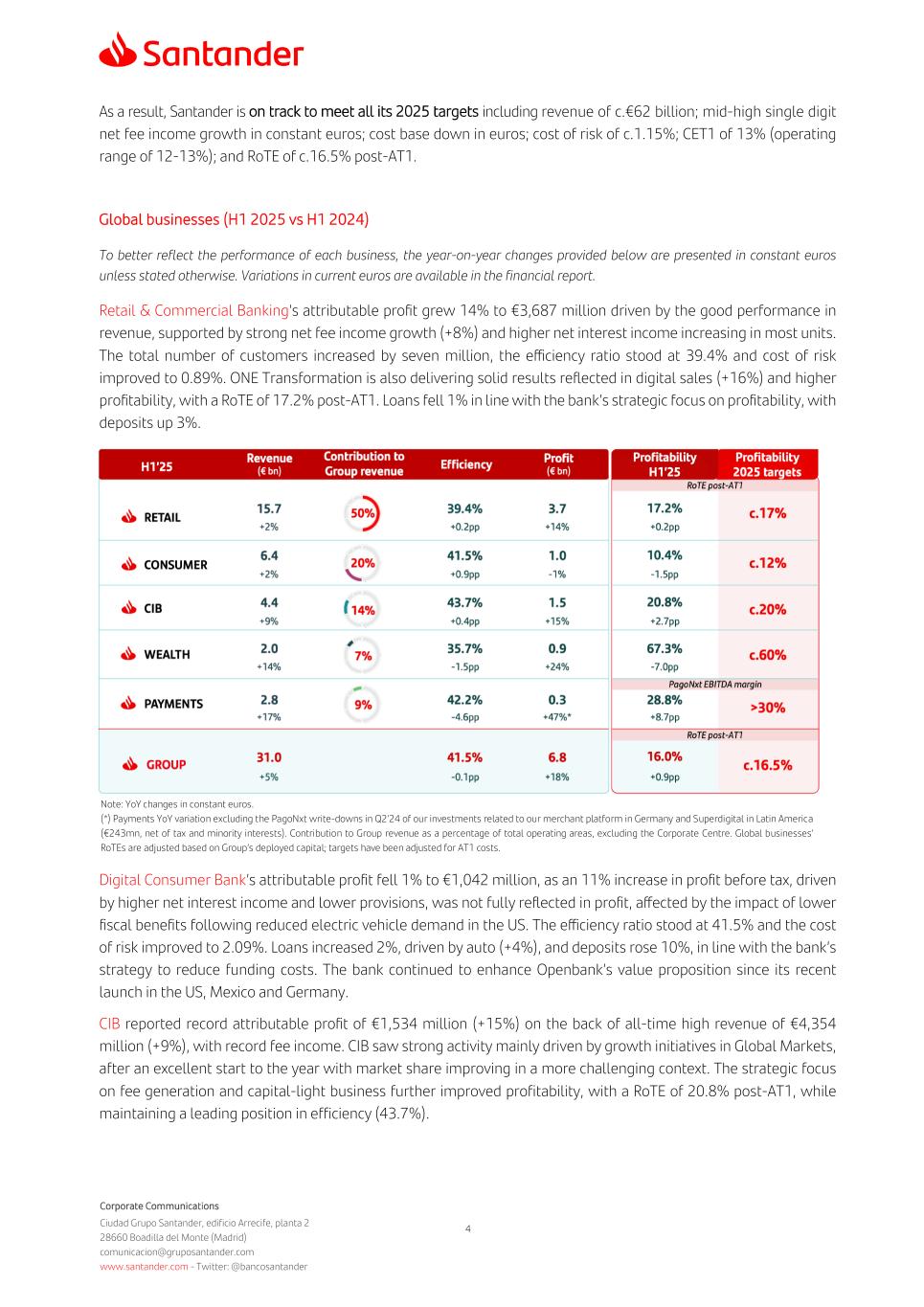 Corporate Communications Ciudad Grupo Santander, edificio Arrecife, planta 2 28660 Boadilla del Monte (Madrid) comunicacion@gruposantander.com www.santander.com - Twitter: @bancosantander 4 As a result, Santander is on track to meet all its 2025 targets including revenue of c.€62 billion; mid-high single digit net fee income growth in constant euros; cost base down in euros; cost of risk of c.1.15%; CET1 of 13% (operating range of 12-13%); and RoTE of c.16.5% post-AT1. Global businesses (H1 2025 vs H1 2024) To better reflect the performance of each business, the year-on-year changes provided below are presented in constant euros unless stated otherwise. Variations in current euros are available in the financial report. Retail & Commercial Banking’s attributable profit grew 14% to €3,687 million driven by the good performance in revenue, supported by strong net fee income growth (+8%) and higher net interest income increasing in most units. The total number of customers increased by seven million, the efficiency ratio stood at 39.4% and cost of risk improved to 0.89%. ONE Transformation is also delivering solid results reflected in digital sales (+16%) and higher profitability, with a RoTE of 17.2% post-AT1. Loans fell 1% in line with the bank’s strategic focus on profitability, with deposits up 3%. Digital Consumer Bank’s attributable profit fell 1% to €1,042 million, as an 11% increase in profit before tax, driven by higher net interest income and lower provisions, was not fully reflected in profit, affected by the impact of lower fiscal benefits following reduced electric vehicle demand in the US. The efficiency ratio stood at 41.5% and the cost of risk improved to 2.09%. Loans increased 2%, driven by auto (+4%), and deposits rose 10%, in line with the bank’s strategy to reduce funding costs. The bank continued to enhance Openbank’s value proposition since its recent launch in the US, Mexico and Germany. CIB reported record attributable profit of €1,534 million (+15%) on the back of all-time high revenue of €4,354 million (+9%), with record fee income. CIB saw strong activity mainly driven by growth initiatives in Global Markets, after an excellent start to the year with market share improving in a more challenging context. The strategic focus on fee generation and capital-light business further improved profitability, with a RoTE of 20.8% post-AT1, while maintaining a leading position in efficiency (43.7%). Note: YoY changes in constant euros. (*) Payments YoY variation excluding the PagoNxt write-downs in Q2’24 of our investments related to our merchant platform in Germany and Superdigital in Latin America (€243mn, net of tax and minority interests). Contribution to Group revenue as a percentage of total operating areas, excluding the Corporate Centre. Global businesses’ RoTEs are adjusted based on Group’s deployed capital; targets have been adjusted for AT1 costs.