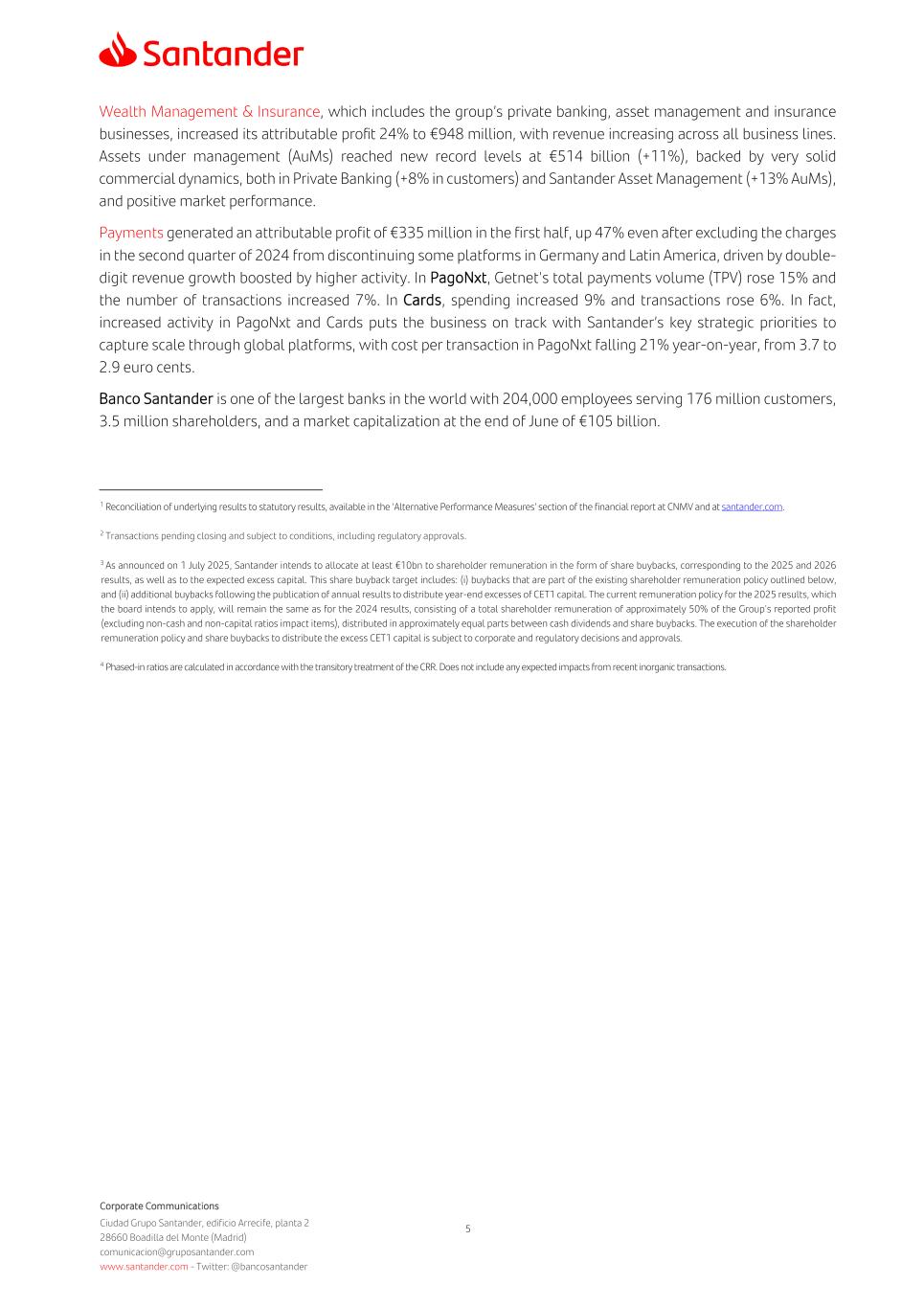 Corporate Communications Ciudad Grupo Santander, edificio Arrecife, planta 2 28660 Boadilla del Monte (Madrid) comunicacion@gruposantander.com www.santander.com - Twitter: @bancosantander 5 Wealth Management & Insurance, which includes the group’s private banking, asset management and insurance businesses, increased its attributable profit 24% to €948 million, with revenue increasing across all business lines. Assets under management (AuMs) reached new record levels at €514 billion (+11%), backed by very solid commercial dynamics, both in Private Banking (+8% in customers) and Santander Asset Management (+13% AuMs), and positive market performance. Payments generated an attributable profit of €335 million in the first half, up 47% even after excluding the charges in the second quarter of 2024 from discontinuing some platforms in Germany and Latin America, driven by double- digit revenue growth boosted by higher activity. In PagoNxt, Getnet's total payments volume (TPV) rose 15% and the number of transactions increased 7%. In Cards, spending increased 9% and transactions rose 6%. In fact, increased activity in PagoNxt and Cards puts the business on track with Santander’s key strategic priorities to capture scale through global platforms, with cost per transaction in PagoNxt falling 21% year-on-year, from 3.7 to 2.9 euro cents. Banco Santander is one of the largest banks in the world with 204,000 employees serving 176 million customers, 3.5 million shareholders, and a market capitalization at the end of June of €105 billion. 1 Reconciliation of underlying results to statutory results, available in the ‘Alternative Performance Measures’ section of the financial report at CNMV and at santander.com. 2 Transactions pending closing and subject to conditions, including regulatory approvals. 3 As announced on 1 July 2025, Santander intends to allocate at least €10bn to shareholder remuneration in the form of share buybacks, corresponding to the 2025 and 2026 results, as well as to the expected excess capital. This share buyback target includes: (i) buybacks that are part of the existing shareholder remuneration policy outlined below, and (ii) additional buybacks following the publication of annual results to distribute year-end excesses of CET1 capital. The current remuneration policy for the 2025 results, which the board intends to apply, will remain the same as for the 2024 results, consisting of a total shareholder remuneration of approximately 50% of the Group's reported profit (excluding non-cash and non-capital ratios impact items), distributed in approximately equal parts between cash dividends and share buybacks. The execution of the shareholder remuneration policy and share buybacks to distribute the excess CET1 capital is subject to corporate and regulatory decisions and approvals. 4 Phased-in ratios are calculated in accordance with the transitory treatment of the CRR. Does not include any expected impacts from recent inorganic transactions.