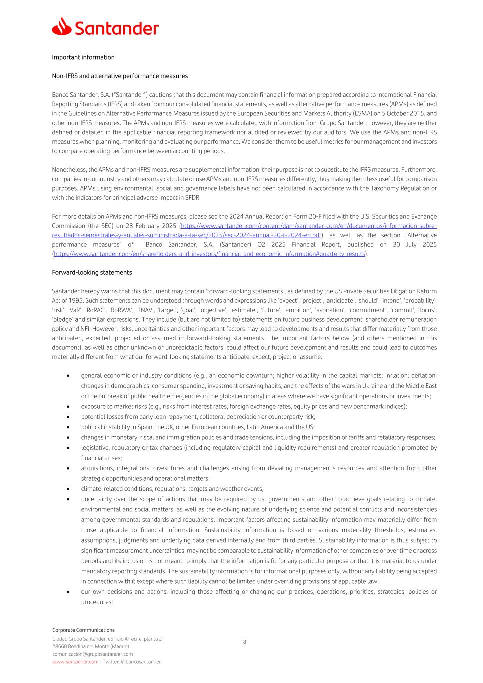 Corporate Communications Ciudad Grupo Santander, edificio Arrecife, planta 2 28660 Boadilla del Monte (Madrid) comunicacion@gruposantander.com www.santander.com - Twitter: @bancosantander 8 Important information Non-IFRS and alternative performance measures Banco Santander, S.A. (“Santander”) cautions that this document may contain financial information prepared according to International Financial Reporting Standards (IFRS) and taken from our consolidated financial statements, as well as alternative performance measures (APMs) as defined in the Guidelines on Alternative Performance Measures issued by the European Securities and Markets Authority (ESMA) on 5 October 2015, and other non-IFRS measures. The APMs and non-IFRS measures were calculated with information from Grupo Santander; however, they are neither defined or detailed in the applicable financial reporting framework nor audited or reviewed by our auditors. We use the APMs and non-IFRS measures when planning, monitoring and evaluating our performance. We consider them to be useful metrics for our management and investors to compare operating performance between accounting periods. Nonetheless, the APMs and non-IFRS measures are supplemental information; their purpose is not to substitute the IFRS measures. Furthermore, companies in our industry and others may calculate or use APMs and non-IFRS measures differently, thus making them less useful for comparison purposes. APMs using environmental, social and governance labels have not been calculated in accordance with the Taxonomy Regulation or with the indicators for principal adverse impact in SFDR. For more details on APMs and non-IFRS measures, please see the 2024 Annual Report on Form 20-F filed with the U.S. Securities and Exchange Commission (the SEC) on 28 February 2025 (https://www.santander.com/content/dam/santander-com/en/documentos/informacion-sobre- resultados-semestrales-y-anuales-suministrada-a-la-sec/2025/sec-2024-annual-20-f-2024-en.pdf), as well as the section “Alternative performance measures” of Banco Santander, S.A. (Santander) Q2 2025 Financial Report, published on 30 July 2025 (https://www.santander.com/en/shareholders-and-investors/financial-and-economic-information#quarterly-results). Forward-looking statements Santander hereby warns that this document may contain 'forward-looking statements', as defined by the US Private Securities Litigation Reform Act of 1995. Such statements can be understood through words and expressions like 'expect', 'project', 'anticipate', 'should', 'intend', 'probability', 'risk', 'VaR', 'RoRAC', 'RoRWA', 'TNAV', 'target', 'goal', 'objective', 'estimate', 'future', 'ambition', 'aspiration', 'commitment', 'commit', 'focus', 'pledge' and similar expressions. They include (but are not limited to) statements on future business development, shareholder remuneration policy and NFI. However, risks, uncertainties and other important factors may lead to developments and results that differ materially from those anticipated, expected, projected or assumed in forward-looking statements. The important factors below (and others mentioned in this document), as well as other unknown or unpredictable factors, could affect our future development and results and could lead to outcomes materially different from what our forward-looking statements anticipate, expect, project or assume: • general economic or industry conditions (e.g., an economic downturn; higher volatility in the capital markets; inflation; deflation; changes in demographics, consumer spending, investment or saving habits; and the effects of the wars in Ukraine and the Middle East or the outbreak of public health emergencies in the global economy) in areas where we have significant operations or investments; • exposure to market risks (e.g., risks from interest rates, foreign exchange rates, equity prices and new benchmark indices); • potential losses from early loan repayment, collateral depreciation or counterparty risk; • political instability in Spain, the UK, other European countries, Latin America and the US; • changes in monetary, fiscal and immigration policies and trade tensions, including the imposition of tariffs and retaliatory responses; • legislative, regulatory or tax changes (including regulatory capital and liquidity requirements) and greater regulation prompted by financial crises; • acquisitions, integrations, divestitures and challenges arising from deviating management’s resources and attention from other strategic opportunities and operational matters; • climate-related conditions, regulations, targets and weather events; • uncertainty over the scope of actions that may be required by us, governments and other to achieve goals relating to climate, environmental and social matters, as well as the evolving nature of underlying science and potential conflicts and inconsistencies among governmental standards and regulations. Important factors affecting sustainability information may materially differ from those applicable to financial information. Sustainability information is based on various materiality thresholds, estimates, assumptions, judgments and underlying data derived internally and from third parties. Sustainability information is thus subject to significant measurement uncertainties, may not be comparable to sustainability information of other companies or over time or across periods and its inclusion is not meant to imply that the information is fit for any particular purpose or that it is material to us under mandatory reporting standards. The sustainability information is for informational purposes only, without any liability being accepted in connection with it except where such liability cannot be limited under overriding provisions of applicable law; • our own decisions and actions, including those affecting or changing our practices, operations, priorities, strategies, policies or procedures;