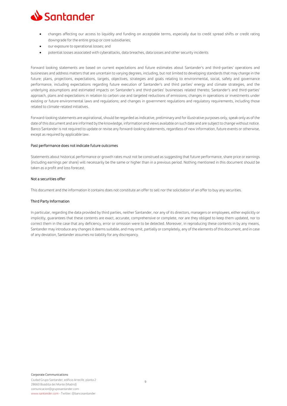 Corporate Communications Ciudad Grupo Santander, edificio Arrecife, planta 2 28660 Boadilla del Monte (Madrid) comunicacion@gruposantander.com www.santander.com - Twitter: @bancosantander 9 • changes affecting our access to liquidity and funding on acceptable terms, especially due to credit spread shifts or credit rating downgrade for the entire group or core subsidiaries; • our exposure to operational losses; and • potential losses associated with cyberattacks, data breaches, data losses and other security incidents Forward looking statements are based on current expectations and future estimates about Santander’s and third-parties’ operations and businesses and address matters that are uncertain to varying degrees, including, but not limited to developing standards that may change in the future; plans, projections, expectations, targets, objectives, strategies and goals relating to environmental, social, safety and governance performance, including expectations regarding future execution of Santander’s and third parties’ energy and climate strategies, and the underlying assumptions and estimated impacts on Santander’s and third-parties’ businesses related thereto; Santander’s and third-parties’ approach, plans and expectations in relation to carbon use and targeted reductions of emissions; changes in operations or investments under existing or future environmental laws and regulations; and changes in government regulations and regulatory requirements, including those related to climate-related initiatives. Forward-looking statements are aspirational, should be regarded as indicative, preliminary and for illustrative purposes only, speak only as of the date of this document and are informed by the knowledge, information and views available on such date and are subject to change without notice. Banco Santander is not required to update or revise any forward-looking statements, regardless of new information, future events or otherwise, except as required by applicable law. Past performance does not indicate future outcomes Statements about historical performance or growth rates must not be construed as suggesting that future performance, share price or earnings (including earnings per share) will necessarily be the same or higher than in a previous period. Nothing mentioned in this document should be taken as a profit and loss forecast. Not a securities offer This document and the information it contains does not constitute an offer to sell nor the solicitation of an offer to buy any securities. Third Party Information In particular, regarding the data provided by third parties, neither Santander, nor any of its directors, managers or employees, either explicitly or implicitly, guarantees that these contents are exact, accurate, comprehensive or complete, nor are they obliged to keep them updated, nor to correct them in the case that any deficiency, error or omission were to be detected. Moreover, in reproducing these contents in by any means, Santander may introduce any changes it deems suitable, and may omit, partially or completely, any of the elements of this document, and in case of any deviation, Santander assumes no liability for any discrepancy.