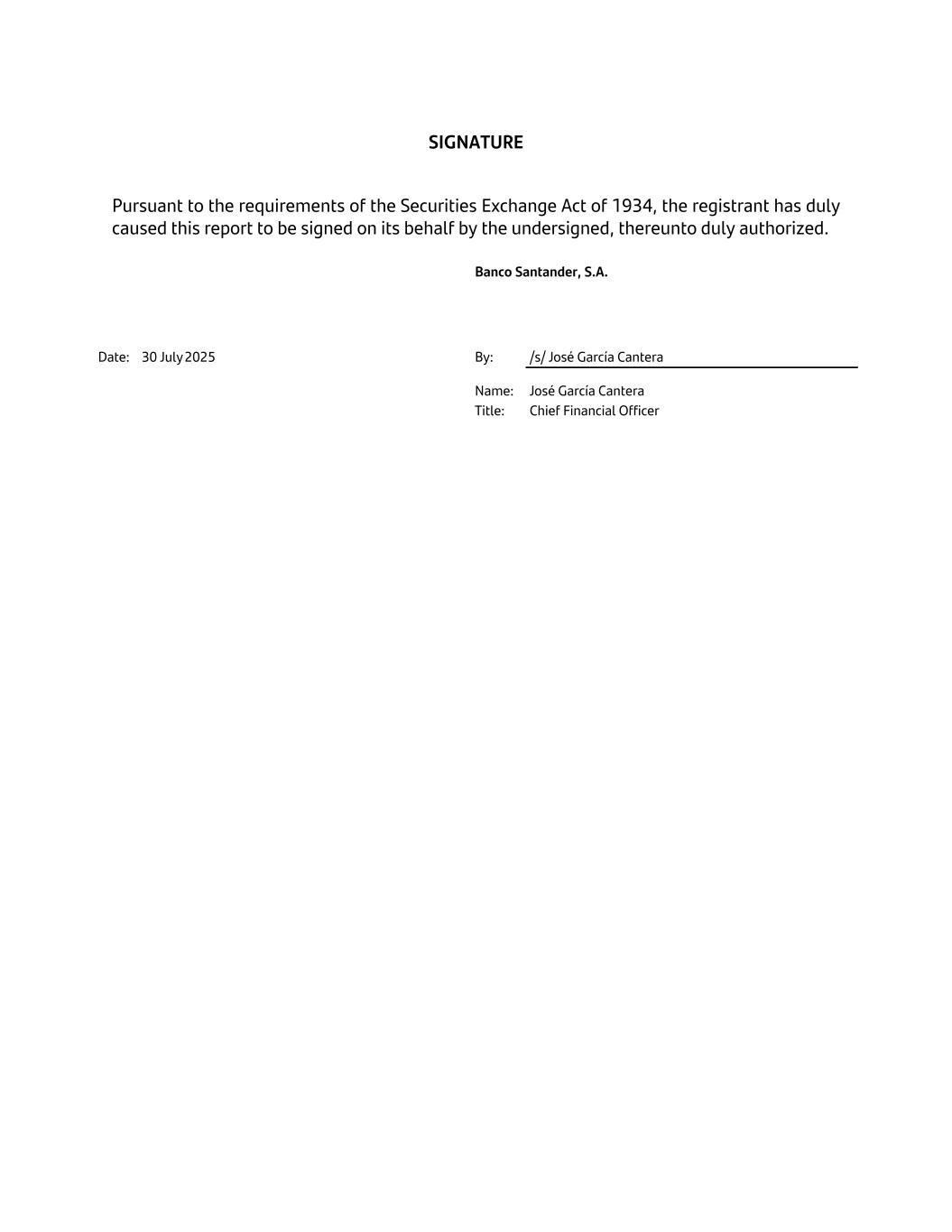 SIGNATURE Pursuant to the requirements of the Securities Exchange Act of 1934, the registrant has duly caused this report to be signed on its behalf by the undersigned, thereunto duly authorized. Banco Santander, S.A. Date: 30 July 2025 By: /s/ José García Cantera Name: José García Cantera Title: Chief Financial Officer