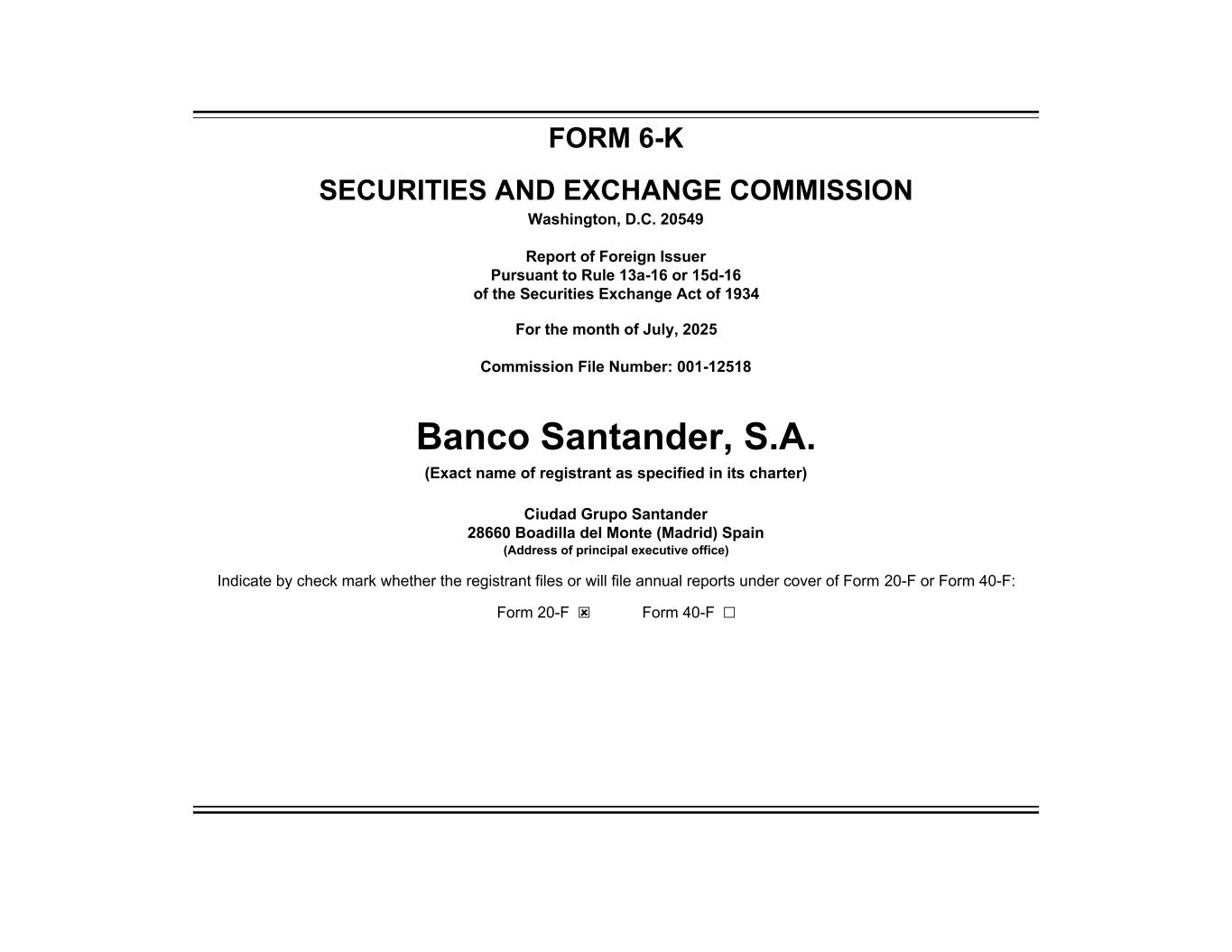 FORM 6-K SECURITIES AND EXCHANGE COMMISSION Washington, D.C. 20549 Report of Foreign Issuer Pursuant to Rule 13a-16 or 15d-16 of the Securities Exchange Act of 1934 For the month of July, 2025 Commission File Number: 001-12518 Banco Santander, S.A. (Exact name of registrant as specified in its charter) Ciudad Grupo Santander 28660 Boadilla del Monte (Madrid) Spain (Address of principal executive office) Indicate by check mark whether the registrant files or will file annual reports under cover of Form 20-F or Form 40-F: Form 20-F ☒ Form 40-F ☐