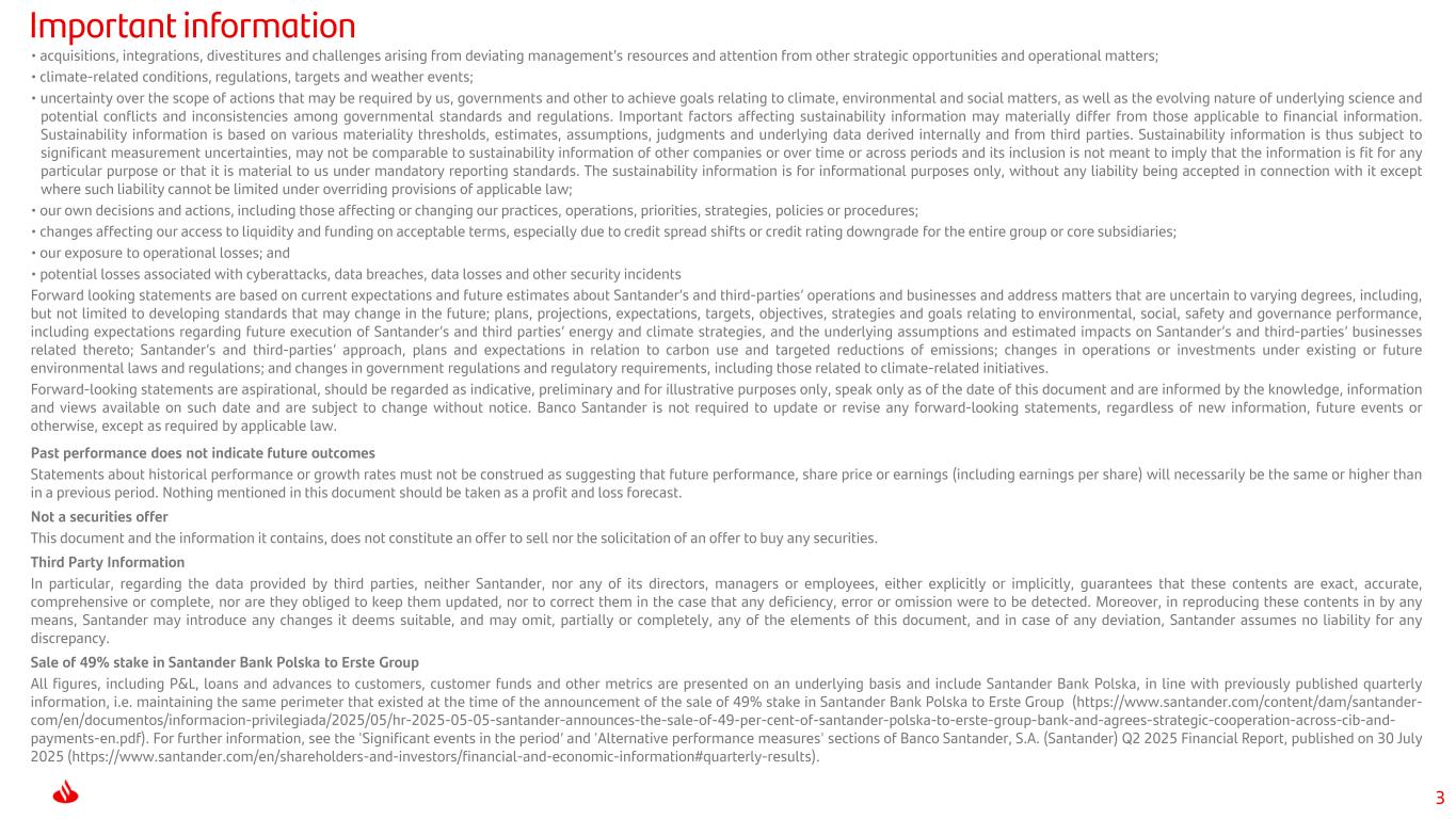 2 Important information Non-IFRS and alternative performance measures Banco Santander, S.A. (“Santander”) cautions that this document may contain financial information prepared according to International Financial Reporting Standards (IFRS) and taken from our consolidated financial statements, as well as alternative performance measures (APMs) as defined in the Guidelines on Alternative Performance Measures issued by the European Securities and Markets Authority (ESMA) on 5 October 2015, and other non-IFRS measures. The APMs and non-IFRS measures were calculated with information from Grupo Santander; however, they are neither defined or detailed in the applicable financial reporting framework nor audited or reviewed by our auditors. We use the APMs and non-IFRS measures when planning, monitoring and evaluating our performance. We consider them to be useful metrics for our management and investors to compare operating performance between accounting periods. Nonetheless, the APMs and non-IFRS measures are supplemental information; their purpose is not to substitute the IFRS measures. Furthermore, companies in our industry and others may calculate or use APMs and non-IFRS measures differently, thus making them less useful for comparison purposes. APMs using environmental, social and governance labels have not been calculated in accordance with the Taxonomy Regulation or with the indicators for principal adverse impact in SFDR. For more details on APMs and non-IFRS measures, please see the 2024 Annual Report on Form 20-F filed with the U.S. Securities and Exchange Commission (the SEC) on 28 February 2025 (https://www.santander.com/content/dam/santander-com/en/documentos/informacion-sobre-resultados-semestrales-y-anuales-suministrada-a-la-sec/2025/sec-2024-annual-20-f-2024-en.pdf), as well as the section “Alternative performance measures” of Banco Santander, S.A. (Santander) Q2 2025 Financial Report, published on 30 July 2025 (https://www.santander.com/en/shareholders-and-investors/financial-and- economic-information#quarterly-results). Sustainability information This document may contain, in addition to financial information, sustainability-related information, including environmental, social and governance-related metrics, statements, goals, targets, commitments and opinions. Sustainability information is not audited nor reviewed by an external auditor. Sustainability information is prepared following various external and internal frameworks, reporting guidelines and measurement, collection and verification methods and practices, which may materially differ from those applicable to financial information and are in many cases emerging and evolving. Sustainability information is based on various materiality thresholds, estimates, assumptions, judgments and underlying data derived internally and from third parties. Sustainability information is thus subject to significant measurement uncertainties may not be comparable to sustainability information of other companies or over time or across periods and its use is not meant to imply that the information is fit for any particular purpose or that it is material to us under mandatory reporting standards. The sustainability information is for informational purposes only, without any liability being accepted in connection with it except where such liability cannot be limited under overriding provisions of applicable law. Forward-looking statements Santander hereby warns that this document may contain 'forward-looking statements', as defined by the US Private Securities Litigation Reform Act of 1995. Such statements can be understood through words and expressions like 'expect', 'project', 'anticipate', 'should', 'intend', 'probability', 'risk', 'VaR', 'RoRAC', 'RoRWA', 'TNAV', 'target', 'goal', 'objective', 'estimate', 'future', 'ambition', 'aspiration', 'commitment', 'commit', 'focus', 'pledge' and similar expressions. They include (but are not limited to) statements on future business development, shareholder remuneration policy and NFI. However, risks, uncertainties and other important factors may lead to developments and results that differ materially from those anticipated, expected, projected or assumed in forward-looking statements. The important factors below (and others mentioned in this document), as well as other unknown or unpredictable factors, could affect our future development and results and could lead to outcomes materially different from what our forward-looking statements anticipate, expect, project or assume: • general economic or industry conditions (e.g., an economic downturn; higher volatility in the capital markets; inflation; deflation; changes in demographics, consumer spending, investment or saving habits; and the effects of the wars in Ukraine and the Middle East or the outbreak of public health emergencies in the global economy) in areas where we have significant operations or investments; • exposure to market risks (e.g., risks from interest rates, foreign exchange rates, equity prices and new benchmark indices); • potential losses from early loan repayment, collateral depreciation or counterparty risk; • political instability in Spain, the UK, other European countries, Latin America and the US; • changes in monetary, fiscal and immigration policies and trade tensions, including the imposition of tariffs and retaliatory responses; • legislative, regulatory or tax changes (including regulatory capital and liquidity requirements) and greater regulation prompted by financial crises;