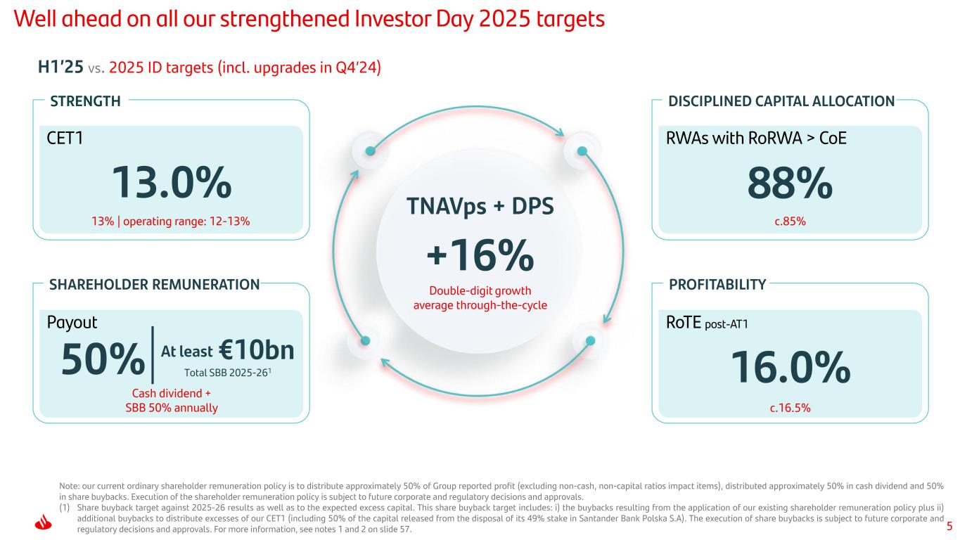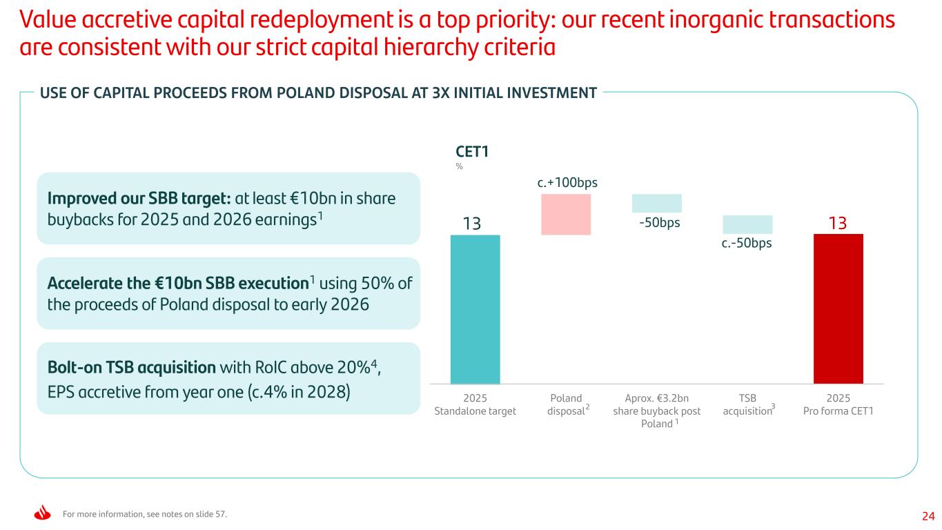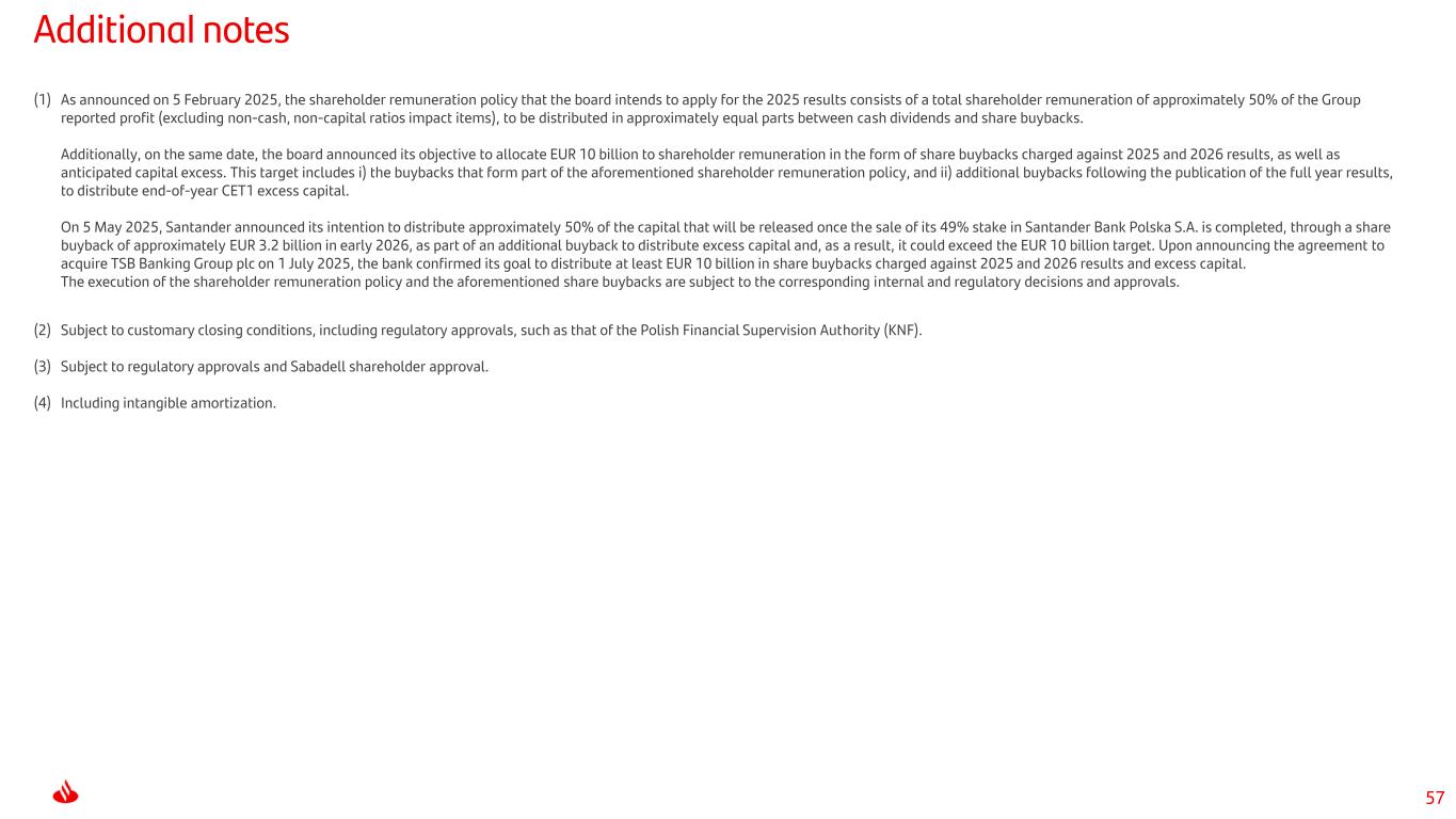 57 Additional notes (1) As announced on 5 February 2025, the shareholder remuneration policy that the board intends to apply for the 2025 results consists of a total shareholder remuneration of approximately 50% of the Group reported profit (excluding non-cash, non-capital ratios impact items), to be distributed in approximately equal parts between cash dividends and share buybacks. Additionally, on the same date, the board announced its objective to allocate EUR 10 billion to shareholder remuneration in the form of share buybacks charged against 2025 and 2026 results, as well as anticipated capital excess. This target includes i) the buybacks that form part of the aforementioned shareholder remuneration policy, and ii) additional buybacks following the publication of the full year results, to distribute end-of-year CET1 excess capital. On 5 May 2025, Santander announced its intention to distribute approximately 50% of the capital that will be released once the sale of its 49% stake in Santander Bank Polska S.A. is completed, through a share buyback of approximately EUR 3.2 billion in early 2026, as part of an additional buyback to distribute excess capital and, as a result, it could exceed the EUR 10 billion target. Upon announcing the agreement to acquire TSB Banking Group plc on 1 July 2025, the bank confirmed its goal to distribute at least EUR 10 billion in share buybacks charged against 2025 and 2026 results and excess capital. The execution of the shareholder remuneration policy and the aforementioned share buybacks are subject to the corresponding internal and regulatory decisions and approvals. (2) Subject to customary closing conditions, including regulatory approvals, such as that of the Polish Financial Supervision Authority (KNF). (3) Subject to regulatory approvals and Sabadell shareholder approval. (4) Including intangible amortization.