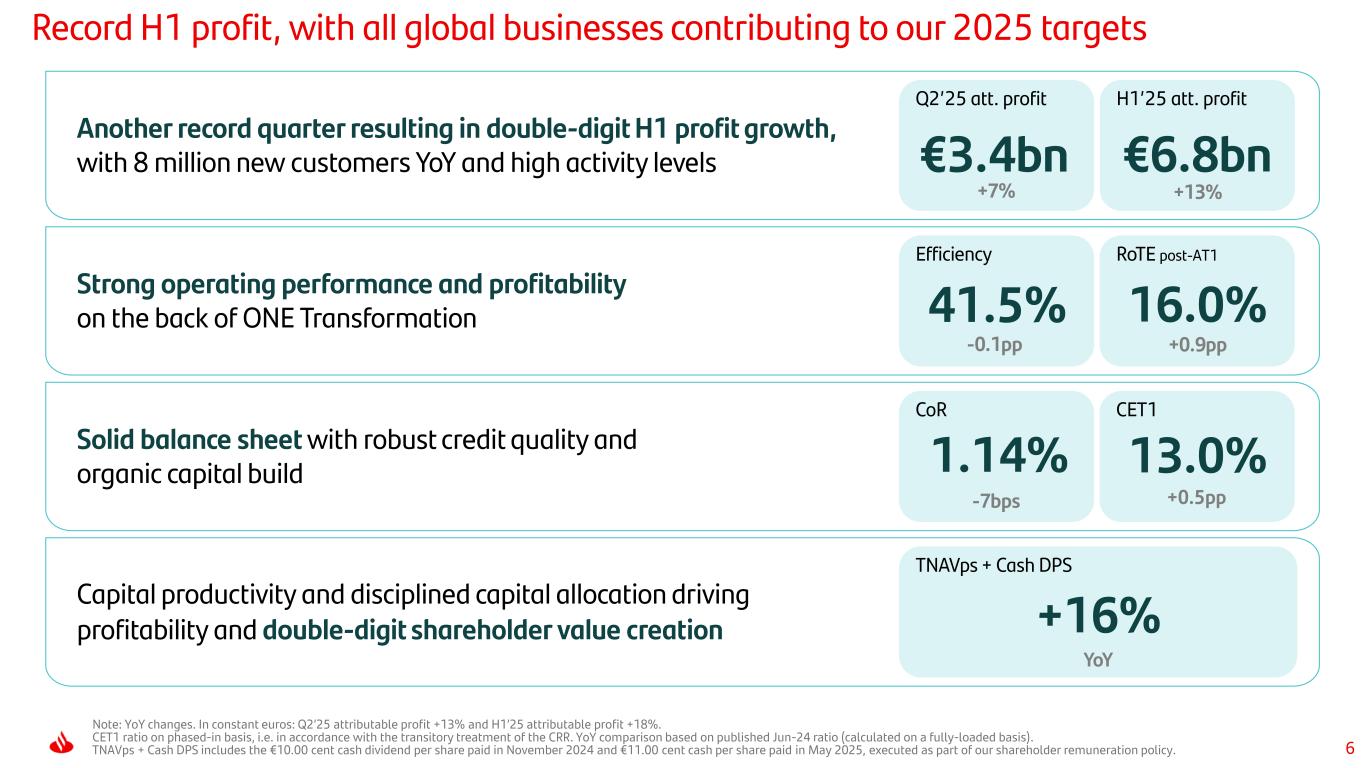 5 Well ahead on all our strengthened Investor Day 2025 targets RoTE post-AT1Payout RWAs with RoRWA > CoECET1 Note: our current ordinary shareholder remuneration policy is to distribute approximately 50% of Group reported profit (excluding non-cash, non-capital ratios impact items), distributed approximately 50% in cash dividend and 50% in share buybacks. Execution of the shareholder remuneration policy is subject to future corporate and regulatory decisions and approvals. (1) Share buyback target against 2025-26 results as well as to the expected excess capital. This share buyback target includes: i) the buybacks resulting from the application of our existing shareholder remuneration policy plus ii) additional buybacks to distribute excesses of our CET1 (including 50% of the capital released from the disposal of its 49% stake in Santander Bank Polska S.A). The execution of share buybacks is subject to future corporate and regulatory decisions and approvals. For more information, see notes 1 and 2 on slide 57. H1’25 vs. 2025 ID targets (incl. upgrades in Q4’24) STRENGTH 13% | operating range: 12-13% DISCIPLINED CAPITAL ALLOCATION c.85% SHAREHOLDER REMUNERATION Cash dividend + SBB 50% annually PROFITABILITY 50% c.16.5% At least €10bn Total SBB 2025-261 TNAVps + DPS Double-digit growth average through-the-cycle 13.0% 88% 16.0% +16%