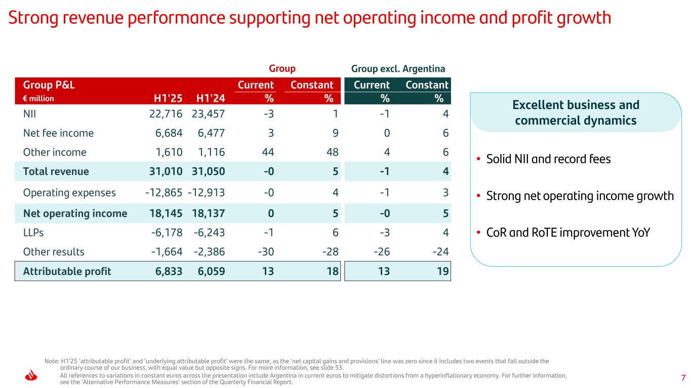6 Record H1 profit, with all global businesses contributing to our 2025 targets H1’25 att. profitQ2’25 att. profit Efficiency RoTE post-AT1 CoR CET1 TNAVps + Cash DPS Another record quarter resulting in double-digit H1 profit growth, with 8 million new customers YoY and high activity levels Strong operating performance and profitability on the back of ONE Transformation Solid balance sheet with robust credit quality and organic capital build Capital productivity and disciplined capital allocation driving profitability and double-digit shareholder value creation YoY 41.5% 1.14% 16.0% 13.0% +16% -7bps +0.9pp-0.1pp Note: YoY changes. In constant euros: Q2’25 attributable profit +13% and H1’25 attributable profit +18%. CET1 ratio on phased-in basis, i.e. in accordance with the transitory treatment of the CRR. YoY comparison based on published Jun-24 ratio (calculated on a fully-loaded basis). TNAVps + Cash DPS includes the €10.00 cent cash dividend per share paid in November 2024 and €11.00 cent cash per share paid in May 2025, executed as part of our shareholder remuneration policy. +13% €3.4bn +7% €6.8bn +0.5pp
