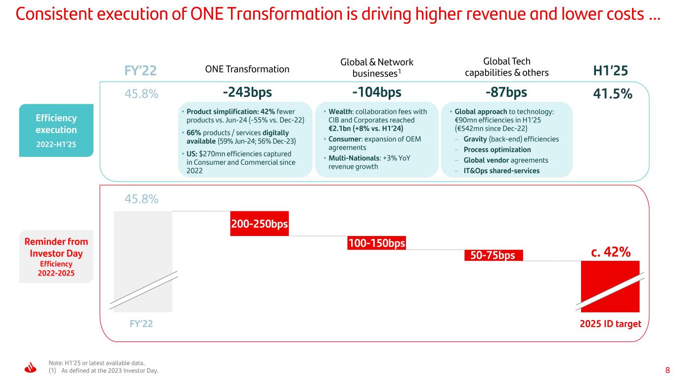 7 Excellent business and commercial dynamics Strong revenue performance supporting net operating income and profit growth • Solid NII and record fees • Strong net operating income growth • CoR and RoTE improvement YoY Note: H1’25 ‘attributable profit' and 'underlying attributable profit’ were the same, as the ‘net capital gains and provisions’ line was zero since it includes two events that fall outside the ordinary course of our business, with equal value but opposite signs. For more information, see slide 53. All references to variations in constant euros across the presentation include Argentina in current euros to mitigate distortions from a hyperinflationary economy. For further information, see the ‘Alternative Performance Measures’ section of the Quarterly Financial Report. Group P&L Current Constant Current Constant € million H1'25 H1'24 % % % % NII 22,716 23,457 -3 1 -1 4 Net fee income 6,684 6,477 3 9 0 6 Other income 1,610 1,116 44 48 4 6 Total revenue 31,010 31,050 -0 5 -1 4 Operating expenses -12,865 -12,913 -0 4 -1 3 Net operating income 18,145 18,137 0 5 -0 5 LLPs -6,178 -6,243 -1 6 -3 4 Other results -1,664 -2,386 -30 -28 -26 -24 Attributable profit 6,833 6,059 13 18 13 19 Group excl. ArgentinaGroup