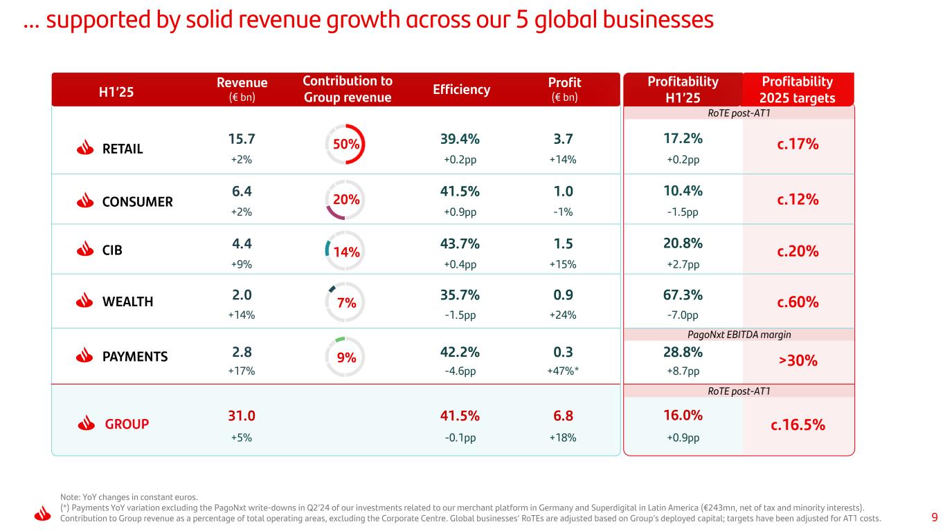 8 Consistent execution of ONE Transformation is driving higher revenue and lower costs … • Wealth: collaboration fees with CIB and Corporates reached €2.1bn (+8% vs. H1’24) • Consumer: expansion of OEM agreements • Multi-Nationals: +3% YoY revenue growth • Product simplification: 42% fewer products vs. Jun-24 (-55% vs. Dec-22) • 66% products / services digitally available (59% Jun-24; 56% Dec-23) • US: $270mn efficiencies captured in Consumer and Commercial since 2022 • Global approach to technology: €90mn efficiencies in H1’25 (€542mn since Dec-22) - Gravity (back-end) efficiencies - Process optimization - Global vendor agreements - IT&Ops shared-services -243bps -104bps -87bps ONE Transformation Global & Network businesses1 Global Tech capabilities & others H1’25FY’22 Note: H1’25 or latest available data. (1) As defined at the 2023 Investor Day. Efficiency execution 2022-H1’25 Reminder from Investor Day Efficiency 2022-2025 200-250bps c. 42% 100-150bps 50-75bps FY’22 2025 ID target 41.5%45.8% 45.8%