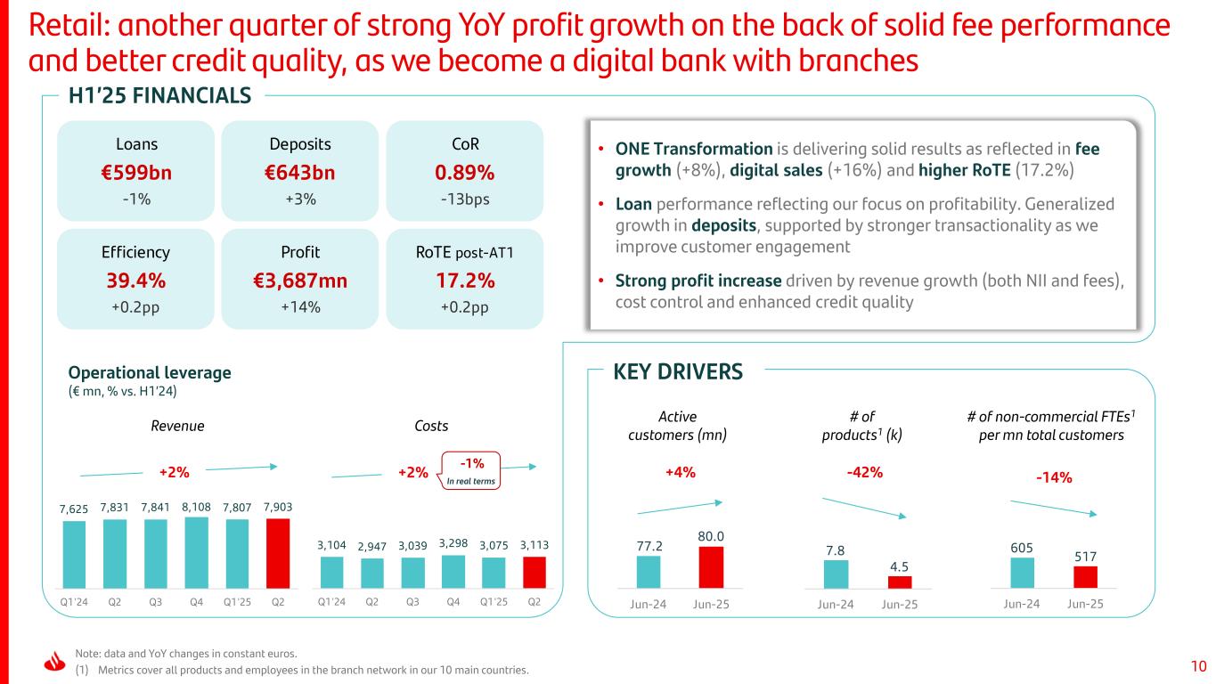 9 15.7 39.4% 3.7 +2% +0.2pp +14% 6.4 41.5% 1.0 +2% +0.9pp -1% 4.4 43.7% 1.5 +9% +0.4pp +15% 2.0 35.7% 0.9 +14% -1.5pp +24% 2.8 42.2% 0.3 +17% -4.6pp +47%* 31.0 41.5% 6.8 +5% -0.1pp +18% +2.7pp 17.2% +0.2pp 10.4% -1.5pp 20.8% 16.0% +0.9pp 67.3% -7.0pp 28.8% +8.7pp … supported by solid revenue growth across our 5 global businesses Note: YoY changes in constant euros. (*) Payments YoY variation excluding the PagoNxt write-downs in Q2’24 of our investments related to our merchant platform in Germany and Superdigital in Latin America (€243mn, net of tax and minority interests). Contribution to Group revenue as a percentage of total operating areas, excluding the Corporate Centre. Global businesses’ RoTEs are adjusted based on Group’s deployed capital; targets have been adjusted for AT1 costs. GROUP CONSUMER CIB WEALTH PAYMENTS RETAIL Revenue (€ bn) Contribution to Group revenue EfficiencyH1’25 Profit (€ bn) c.17% c.12% c.20% c.60% >30% c.16.5% RoTE post-AT1 PagoNxt EBITDA margin RoTE post-AT1 Profitability 2025 targets Profitability H1’25 50% 20% 14% 7% 9%