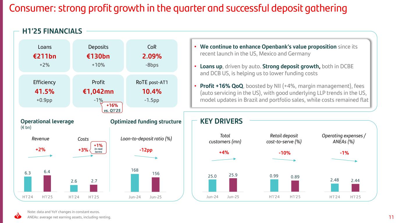 10 H1’25 FINANCIALS Note: data and YoY changes in constant euros. (1) Metrics cover all products and employees in the branch network in our 10 main countries. Retail: another quarter of strong YoY profit growth on the back of solid fee performance and better credit quality, as we become a digital bank with branches # of products1 (k) # of non-commercial FTEs1 per mn total customers Active customers (mn) KEY DRIVERSOperational leverage (€ mn, % vs. H1’24) CostsRevenue Deposits €643bn +3% CoR 0.89% -13bps Efficiency 39.4% +0.2pp Profit €3,687mn +14% RoTE post-AT1 17.2% +0.2pp Loans €599bn -1% 3,104 2,947 3,039 3,298 3,075 3,113 Q1'24 Q2 Q3 Q4 Q1'25 Q2 77.2 80.0 Jun-24 Jun-25 -42%+4%+2% +2% 7,625 7,831 7,841 8,108 7,807 7,903 Q1'24 Q2 Q3 Q4 Q1'25 Q2 • ONE Transformation is delivering solid results as reflected in fee growth (+8%), digital sales (+16%) and higher RoTE (17.2%) • Loan performance reflecting our focus on profitability. Generalized growth in deposits, supported by stronger transactionality as we improve customer engagement • Strong profit increase driven by revenue growth (both NII and fees), cost control and enhanced credit quality In real terms -1% -14% 605 517 Jun-24 Jun-25 7.8 4.5 Jun-24 Jun-25