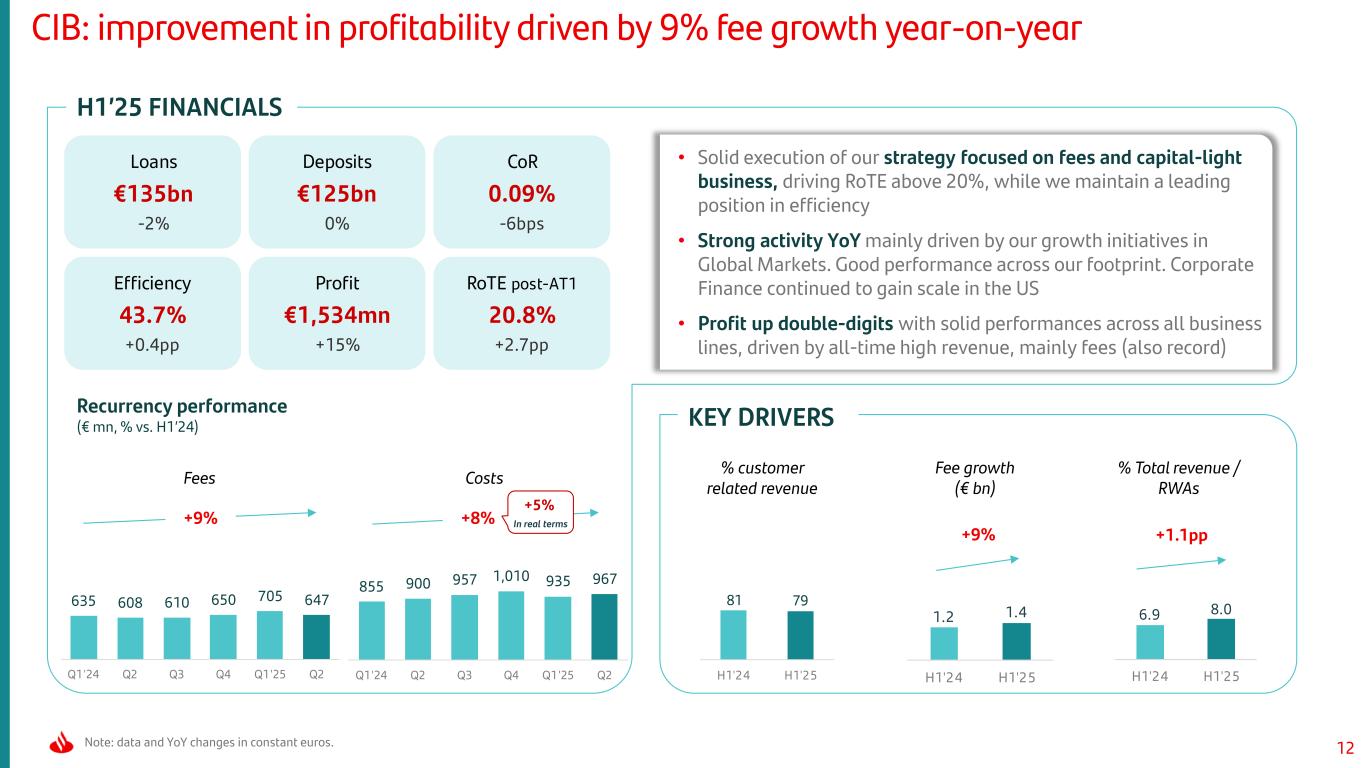 11 • We continue to enhance Openbank’s value proposition since its recent launch in the US, Mexico and Germany • Loans up, driven by auto. Strong deposit growth, both in DCBE and DCB US, is helping us to lower funding costs • Profit +16% QoQ, boosted by NII (+4%, margin management), fees (auto servicing in the US), with good underlying LLP trends in the US, model updates in Brazil and portfolio sales, while costs remained flat H1’25 FINANCIALS Note: data and YoY changes in constant euros. ANEAs: average net earning assets, including renting. Consumer: strong profit growth in the quarter and successful deposit gathering Retail deposit cost-to-serve (%) Operating expenses / ANEAs (%) KEY DRIVERSOperational leverage (€ bn) CostsRevenue Loan-to-deposit ratio (%) Optimized funding structure Total customers (mn) Loans €211bn +2% Deposits €130bn +10% Efficiency 41.5% +0.9pp Profit €1,042mn -1% RoTE post-AT1 10.4% -1.5pp CoR 2.09% -8bps +2% +3% 6.3 6.4 H1'24 H1'25 168 156 Jun-24 Jun-25 -12pp 25.0 25.9 Jun-24 Jun-25 +4% 2.6 2.7 H1'24 H1'25 +16% vs. Q1’25 In real terms +1% 0.99 0.89 H1'24 H1'25 -10% 2.48 2.44 H1'24 H1'25 -1%